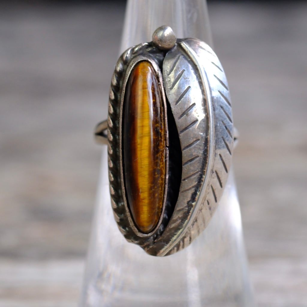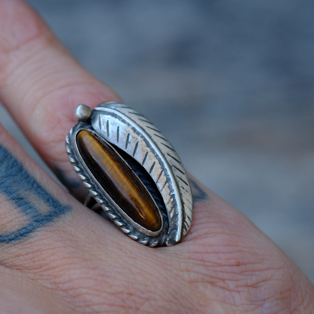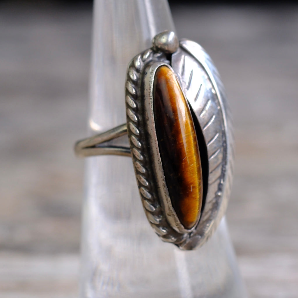 Vintage Sterling Tigers Eye Feather Ring 5.5