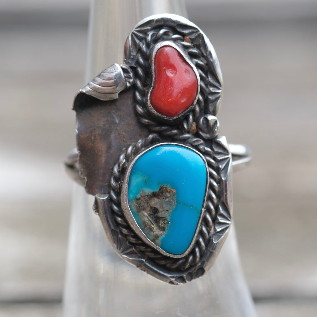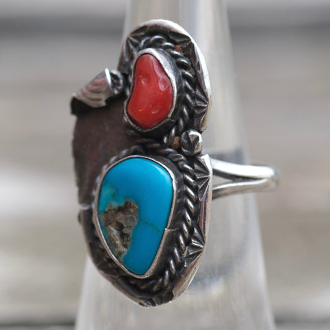 Vintage Sterling Turquoise and Coral Ring 5.75