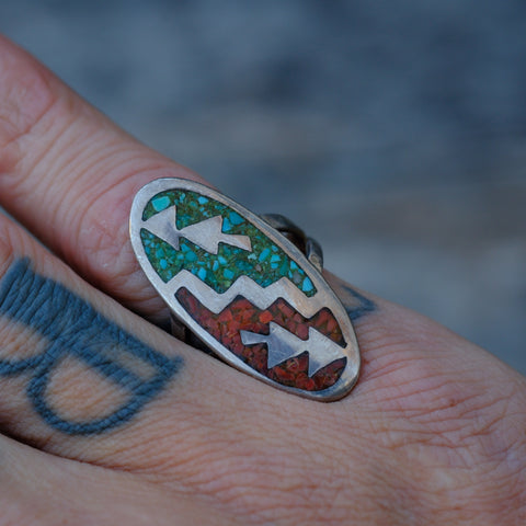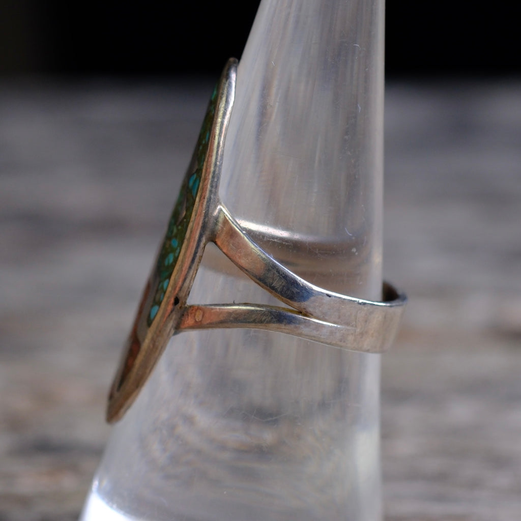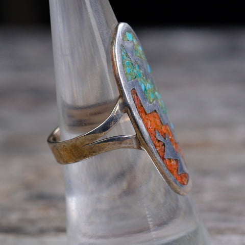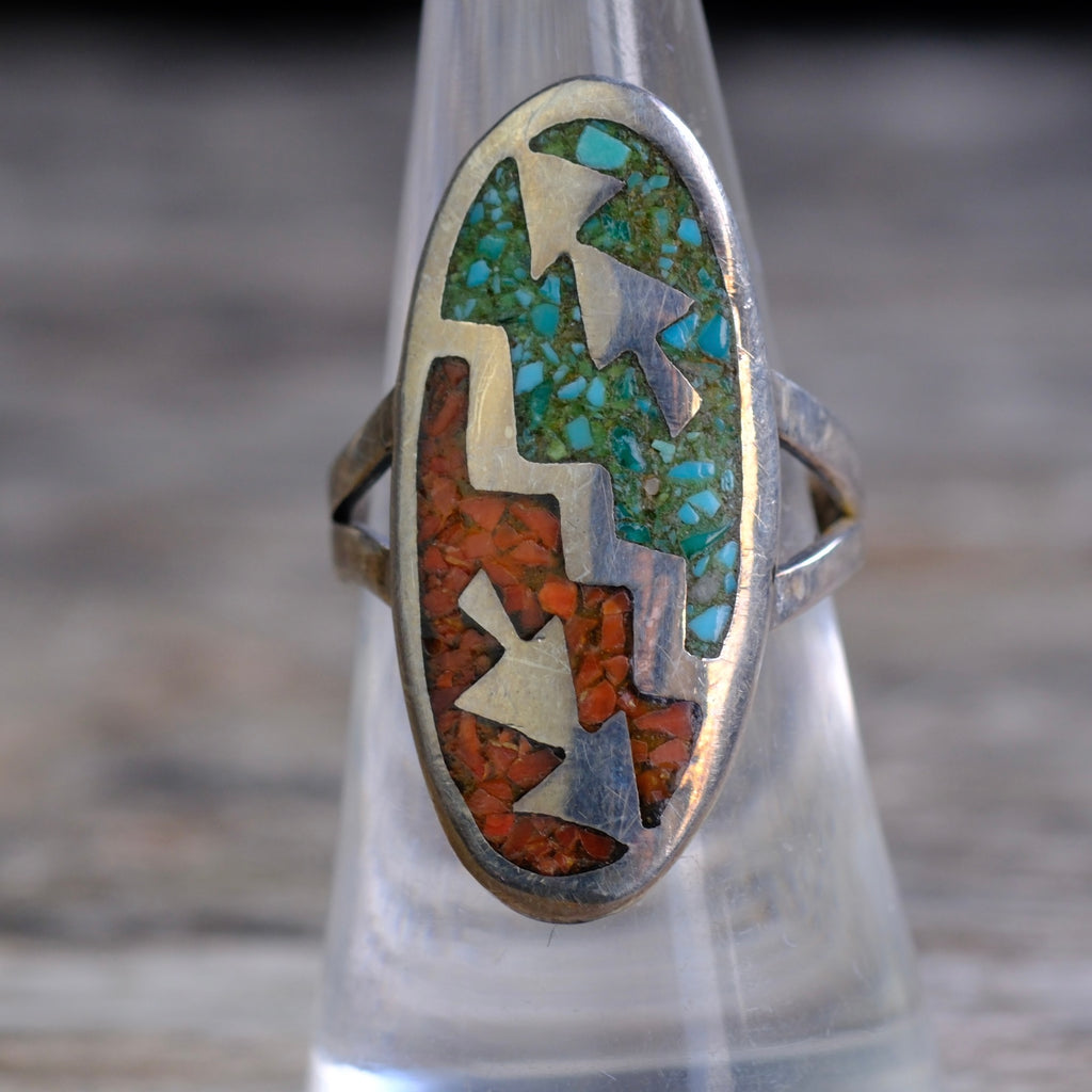 Vintage Sterling Turquoise and Coral Inlay Ring 7.75