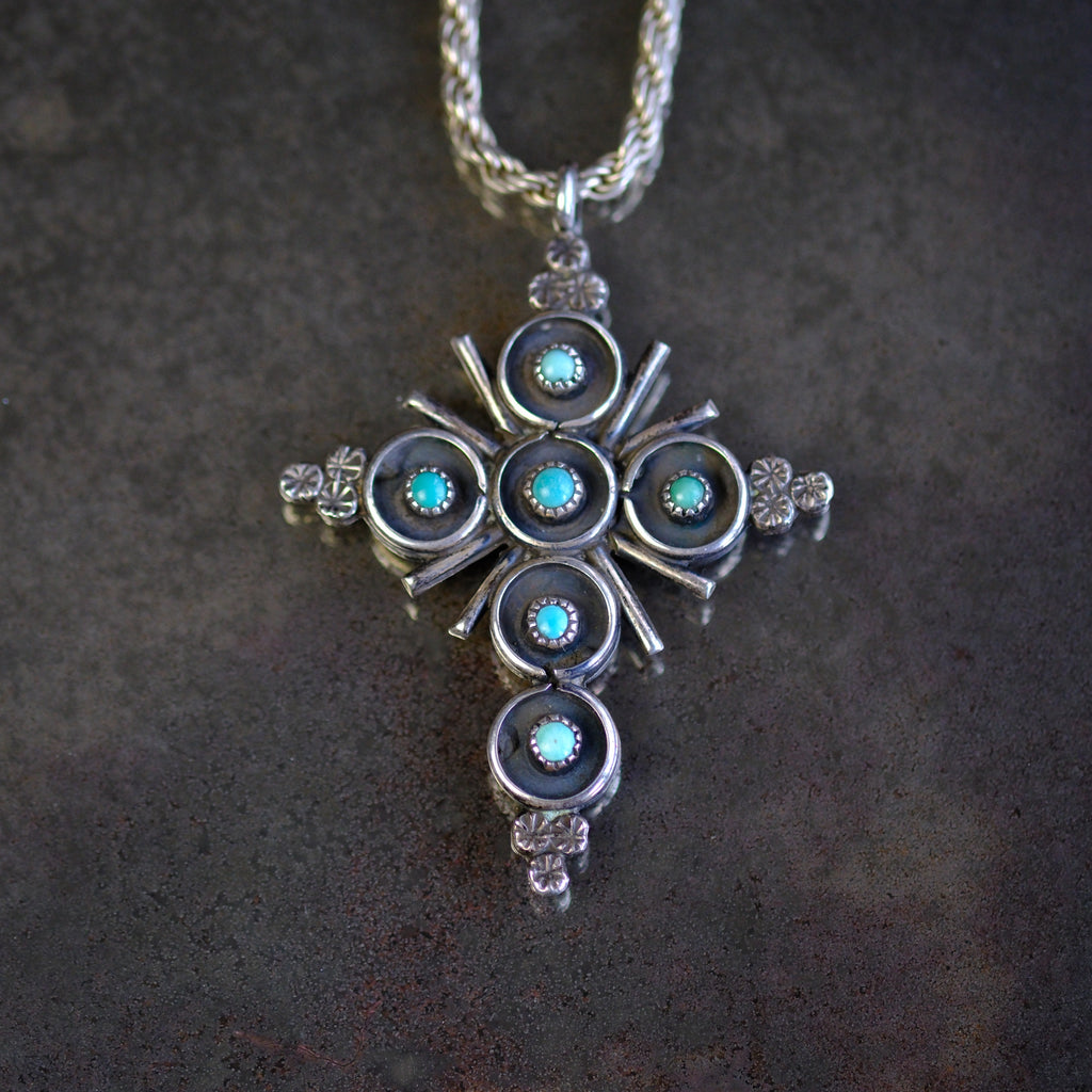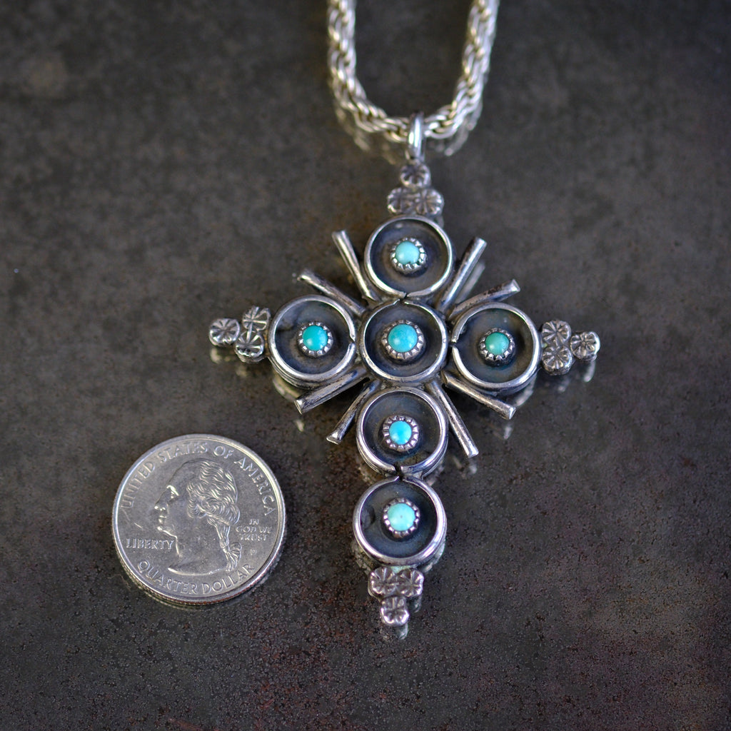 MASSIVE Vintage Sterling Turquoise and Coral Reversible Cross Necklace