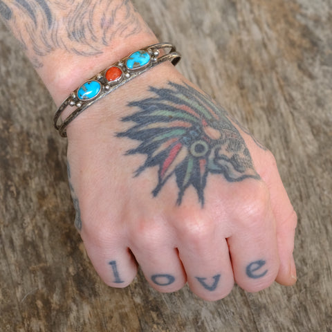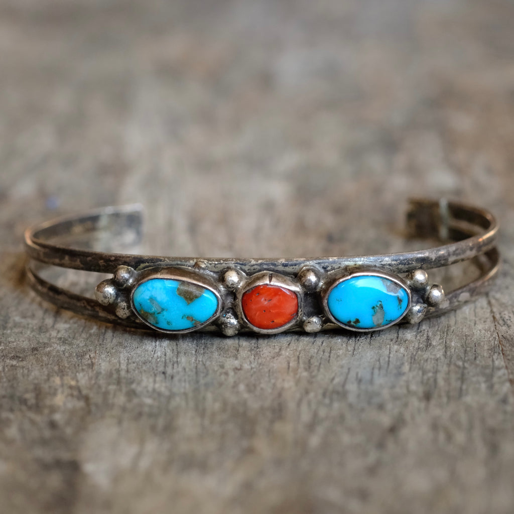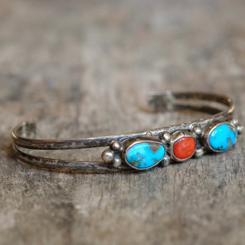 Vintage Sterling Turquoise and Coral Cuff Bracelet