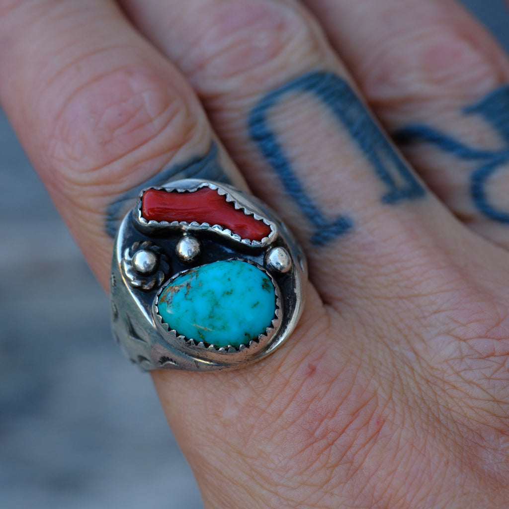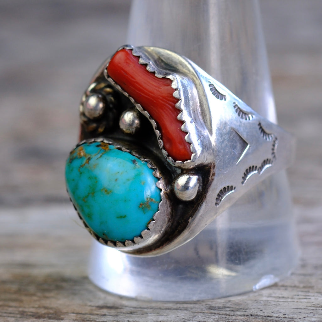Vintage Sterling Turquoise and Coral Stamped Band Ring