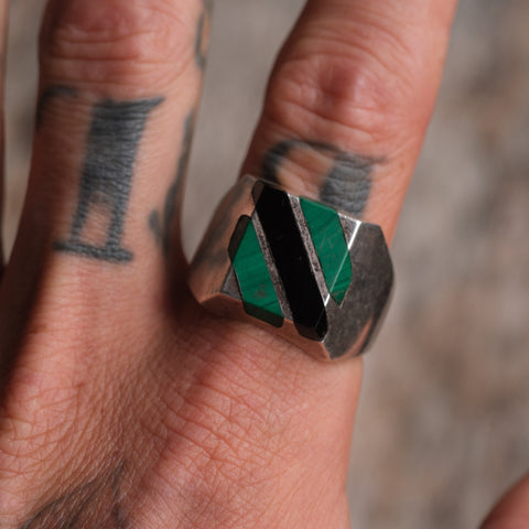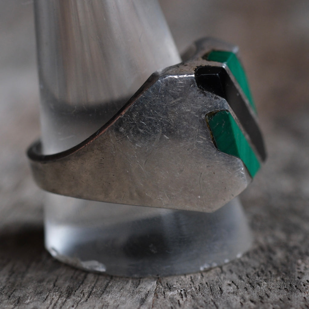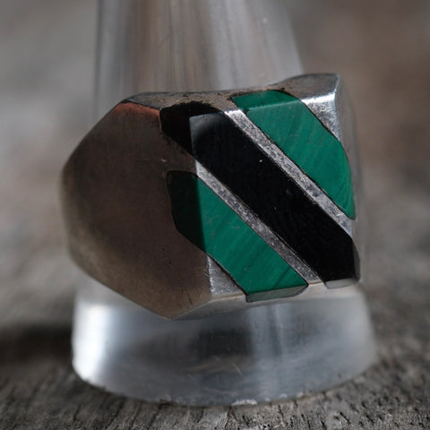 Vintage Sterling Malachite and Onyx Inlay Striper Ring