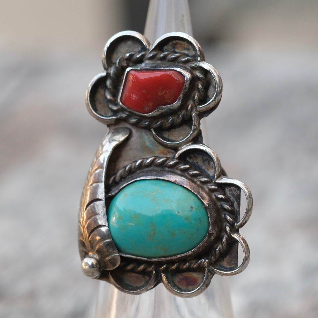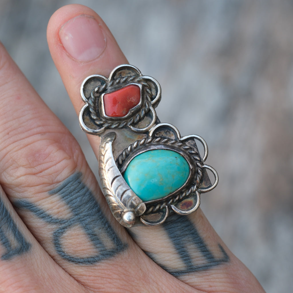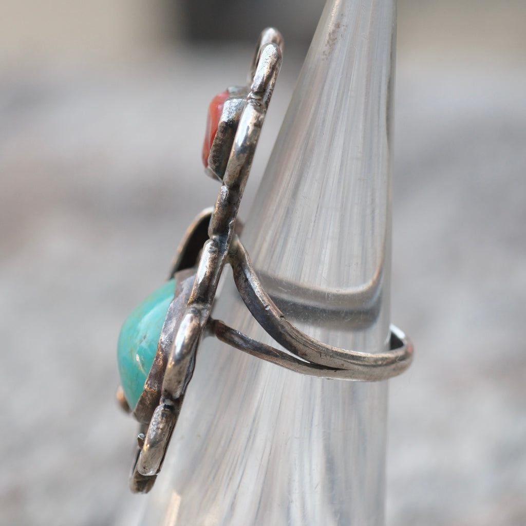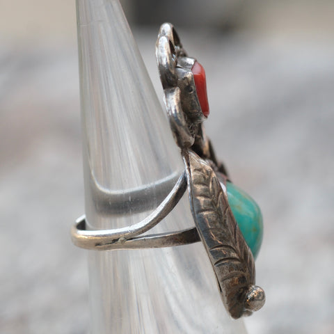 Vintage Sterling Turquoise and Coral Feather Ring 4