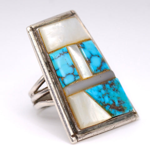 HUGE Vintage Sterling Turquoise and Mother Of Pearl Inlay Ring