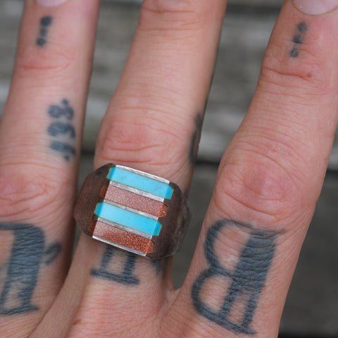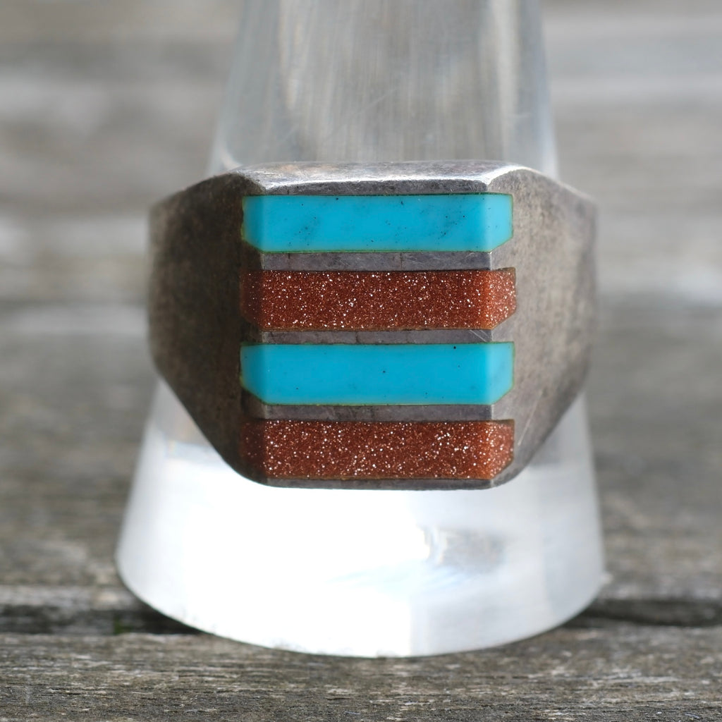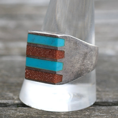 Vintage Sterling Turquoise and Goldstone Inlay Striper Ring