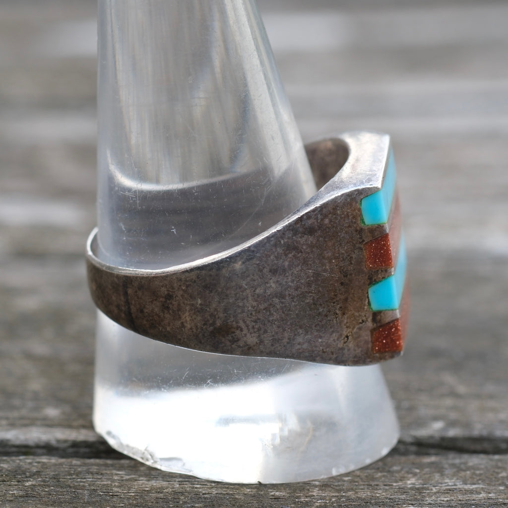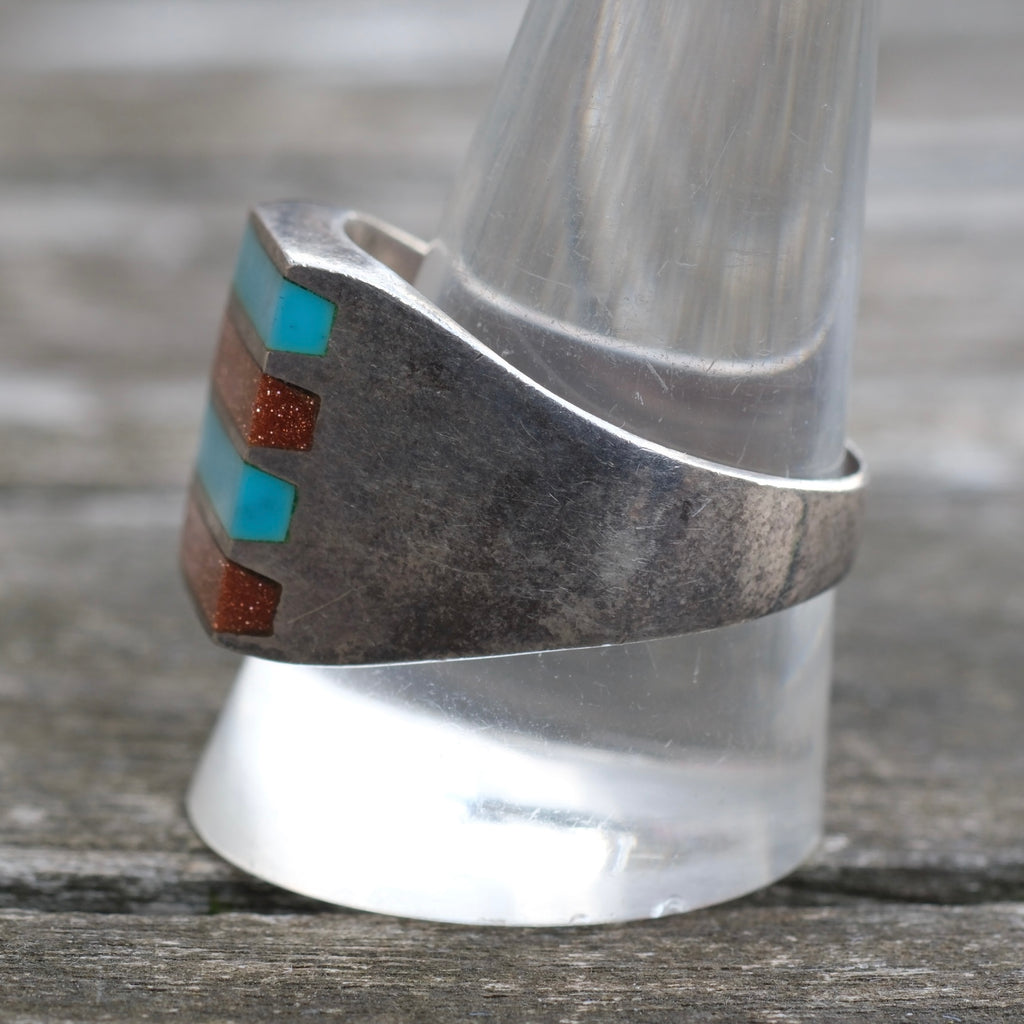Vintage Sterling Turquoise and Goldstone Inlay Striper Ring 12