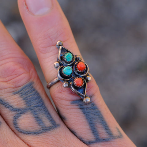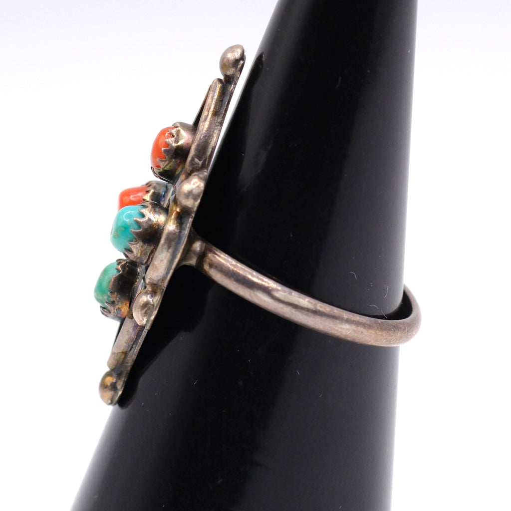 Vintage Sterling Turquoise and Coral Cluster Ring 4.5