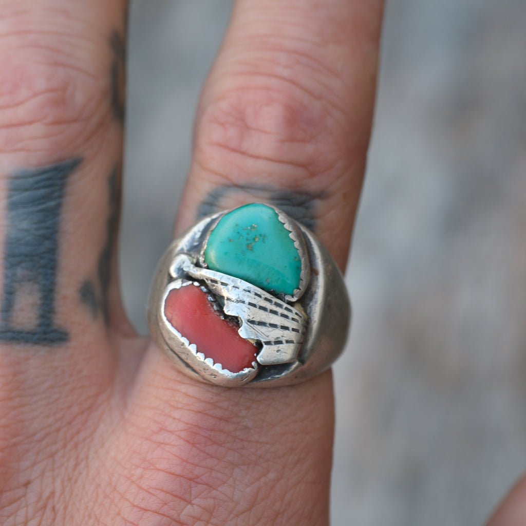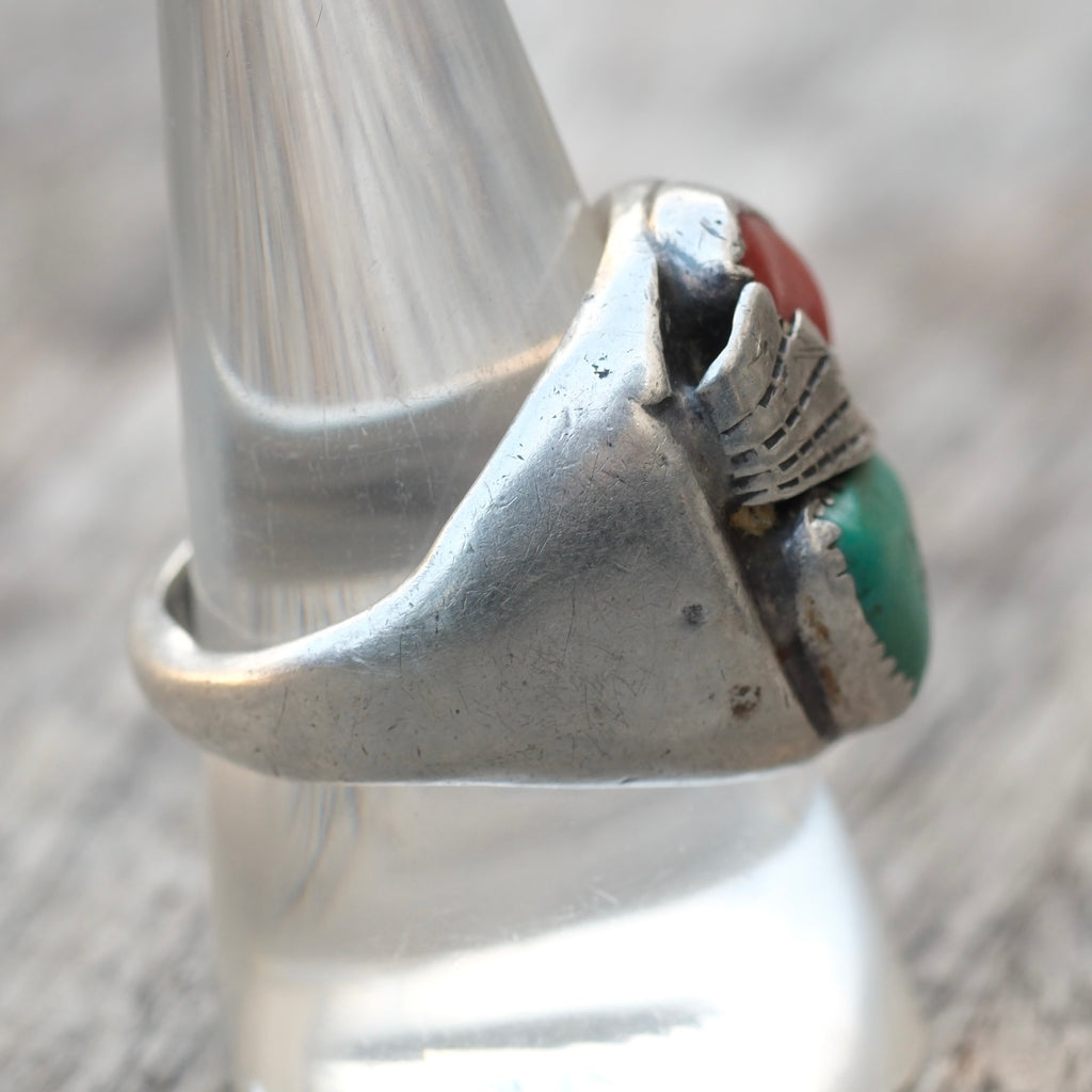 Vintage Sterling Turquoise and Coral Feather Ring 9.75