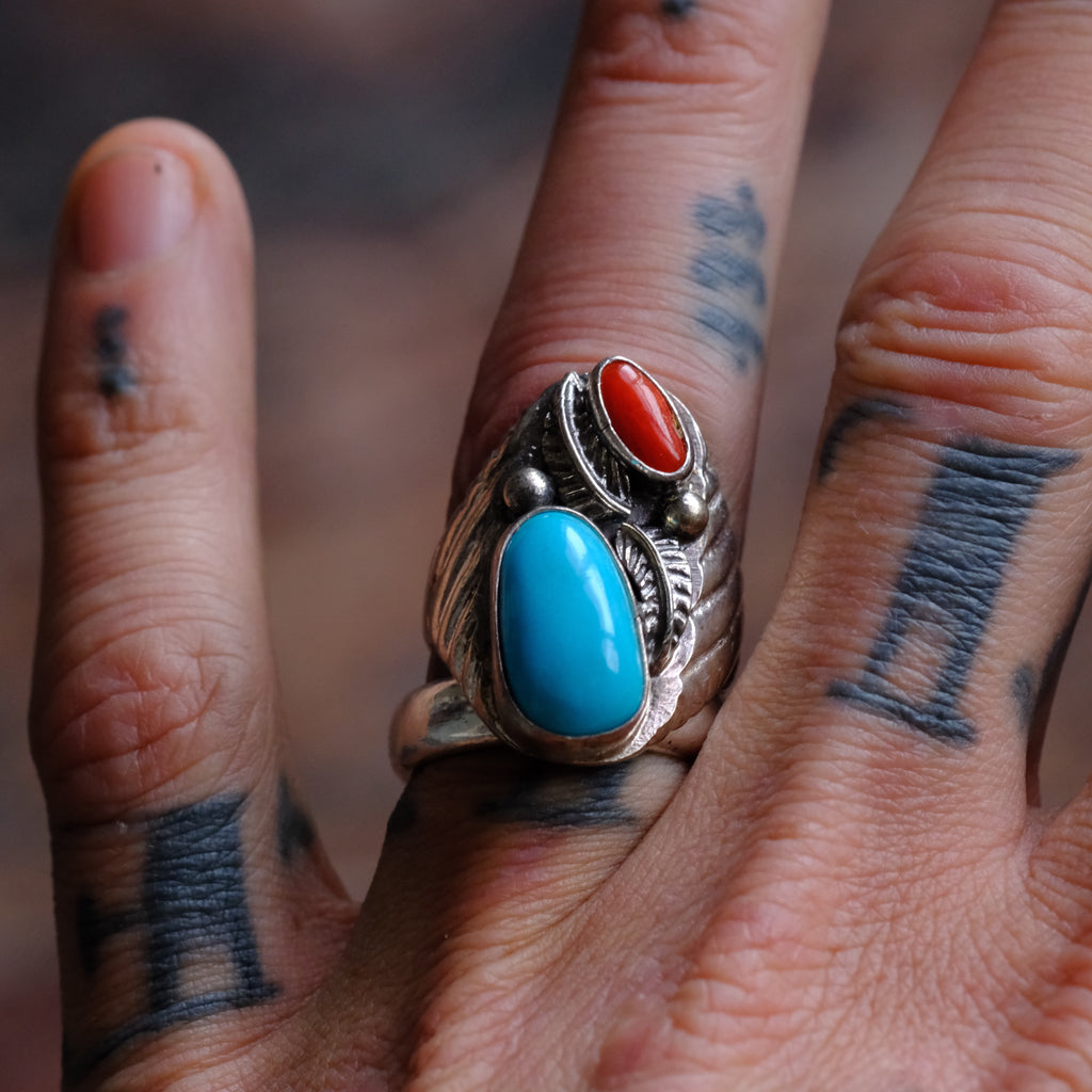 Vintage Sterling Turquoise and Coral Feather Ring