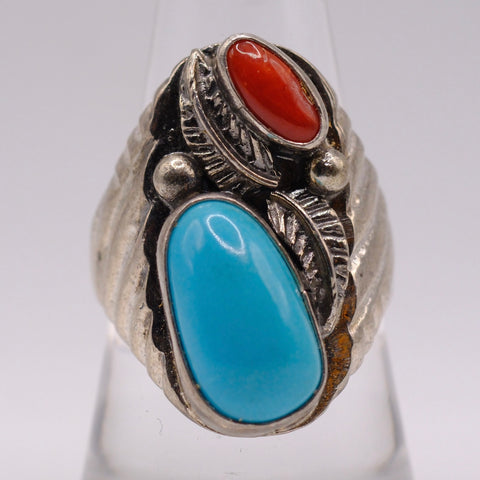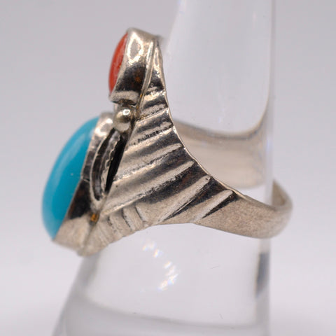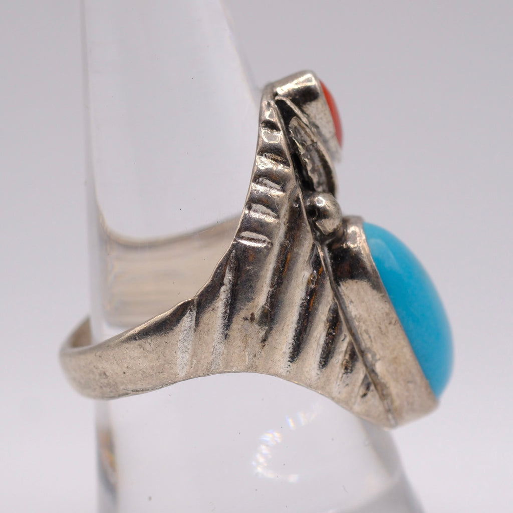 Vintage Sterling Turquoise and Coral Feather Ring 9.25