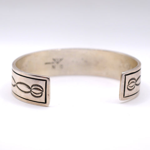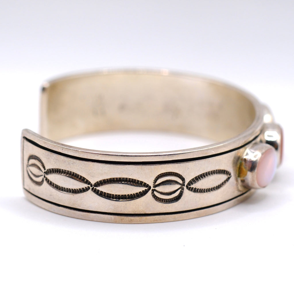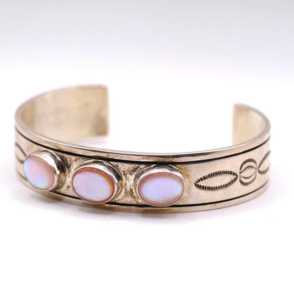 Vintage Sterling 3-Stone Mother Of Pearl Stamped Cuff Bracelet