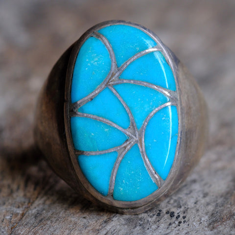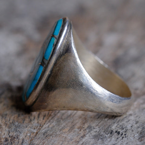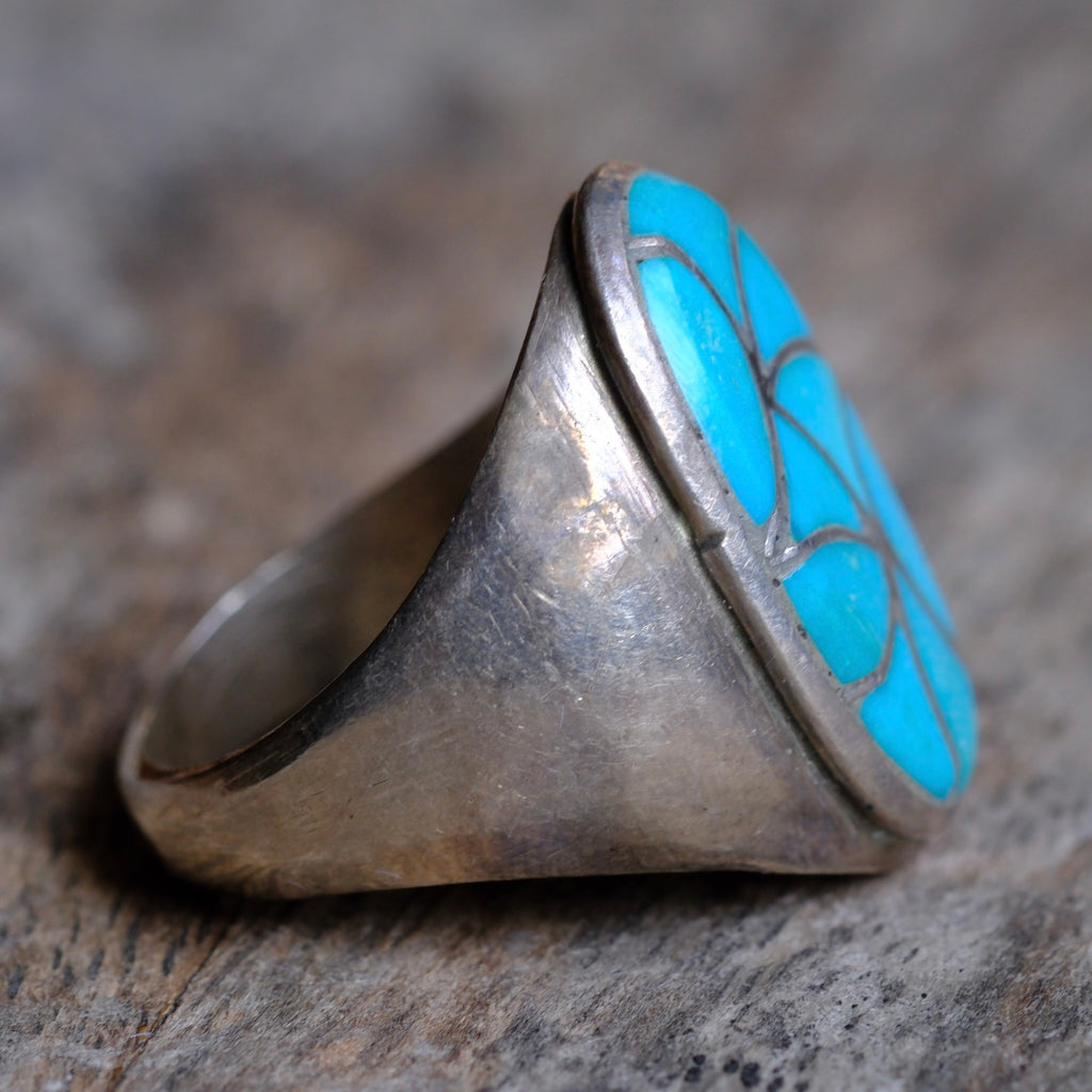 Vintage Sterling Turquoise Fish Scale Inlay Ring 12.75