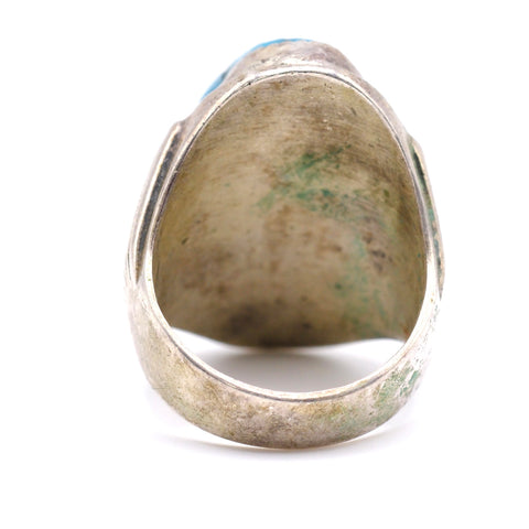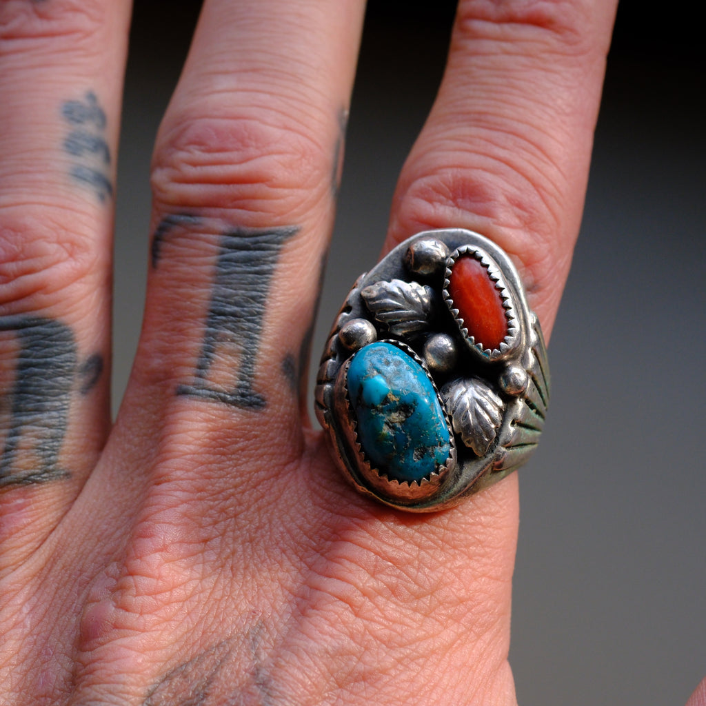Vintage Sterling Turquoise and Coral Feather Ring 11.5