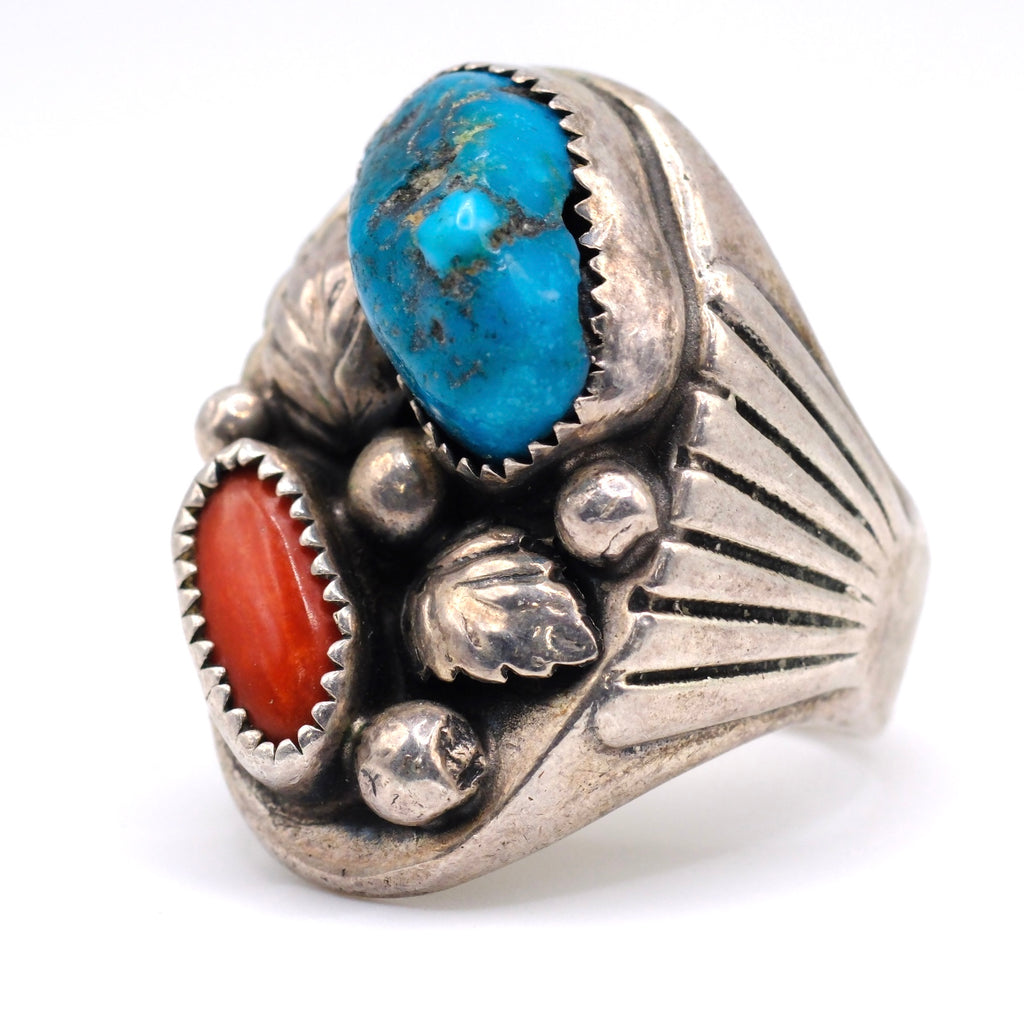 Vintage Sterling Turquoise and Coral Feather Ring