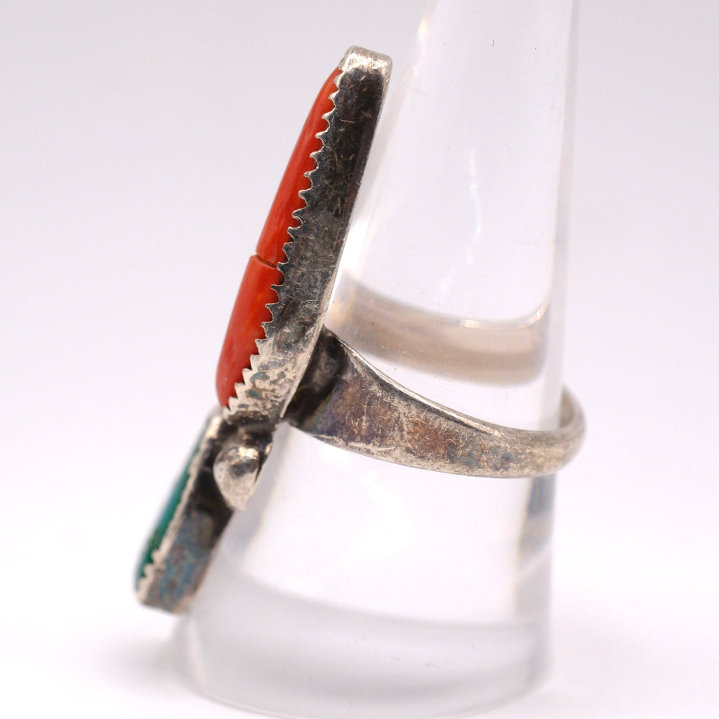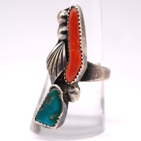Vintage Sterling Turquoise and Coral Feather Ring 8.75