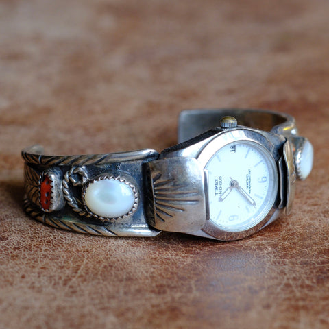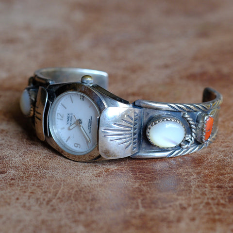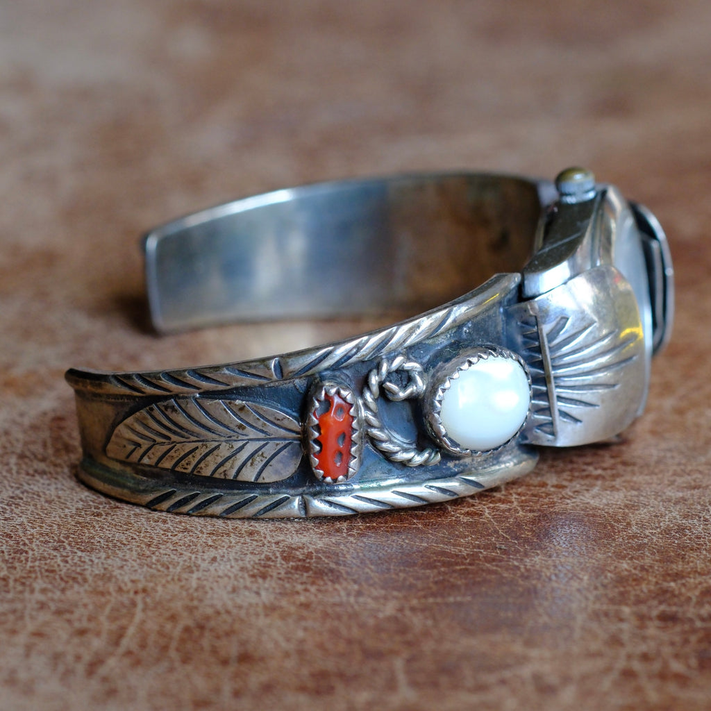Vintage Sterling Mother Of Pearl and Coral Watch Cuff Bracelet