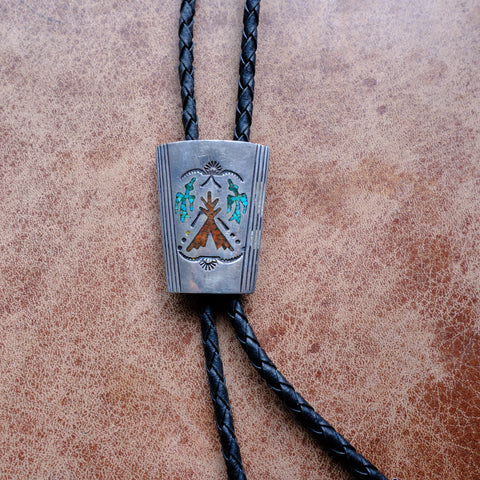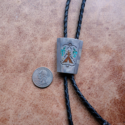 Vintage Sterling Turquoise and Coral Inlay Bolo Tie