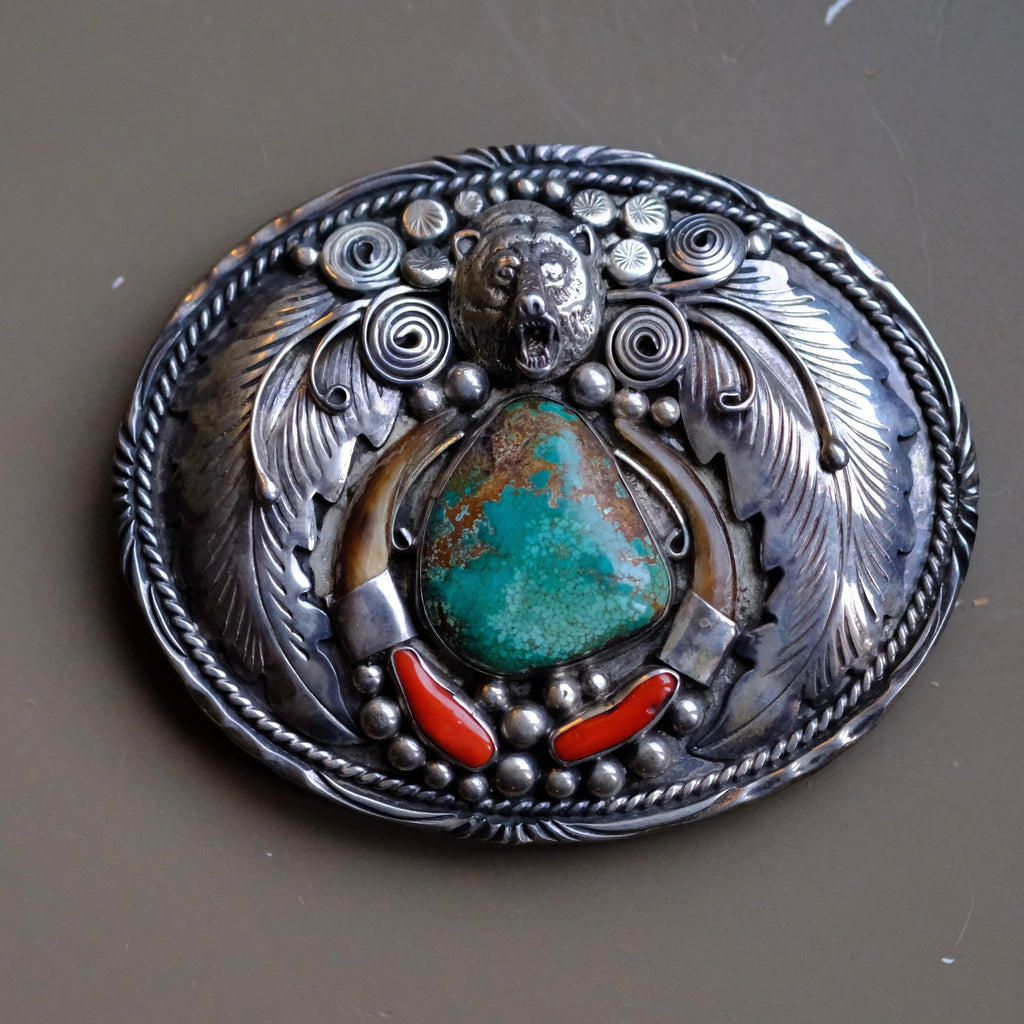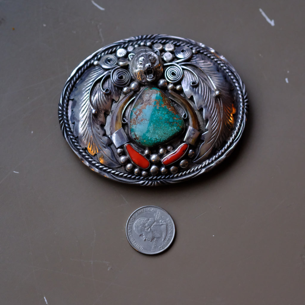 Vintage Sterling Turquoise and Coral Bear Claw Belt Buckle