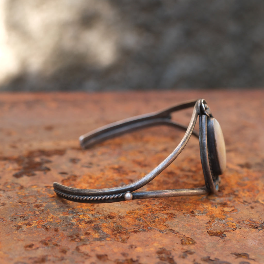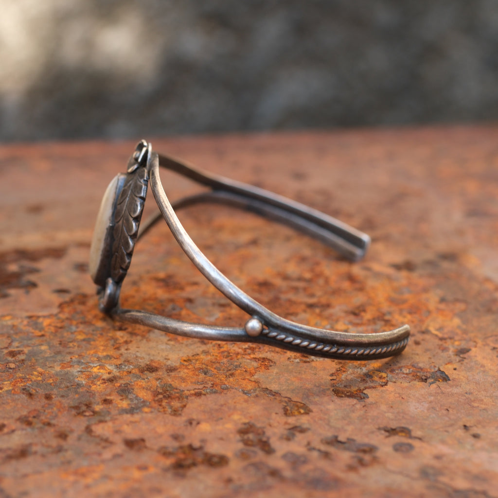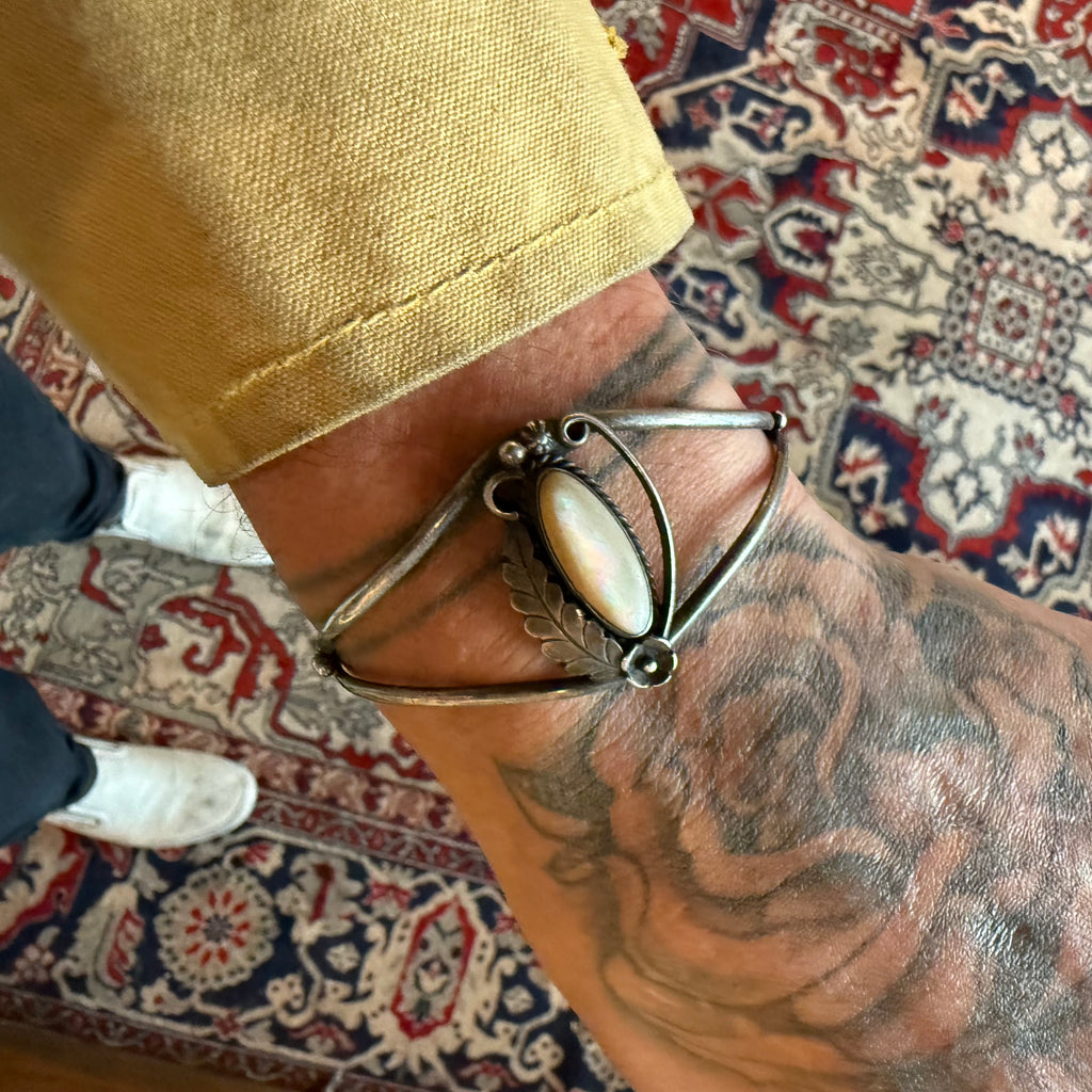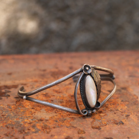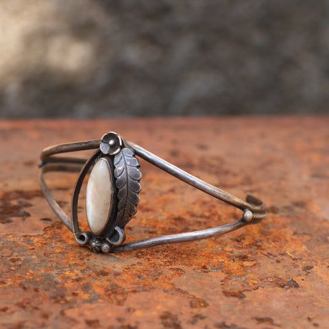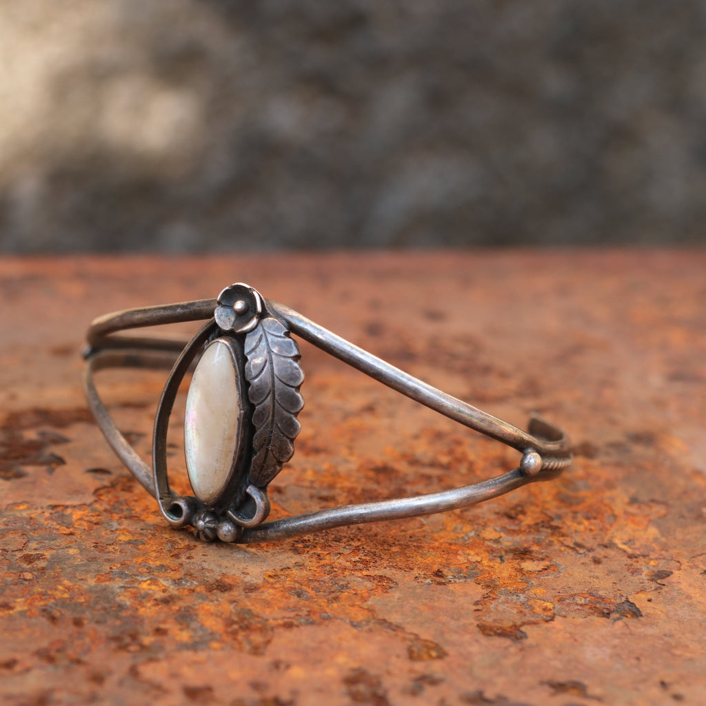 Vintage Sterling Mother Of Pearl Feather Cuff Bracelet
