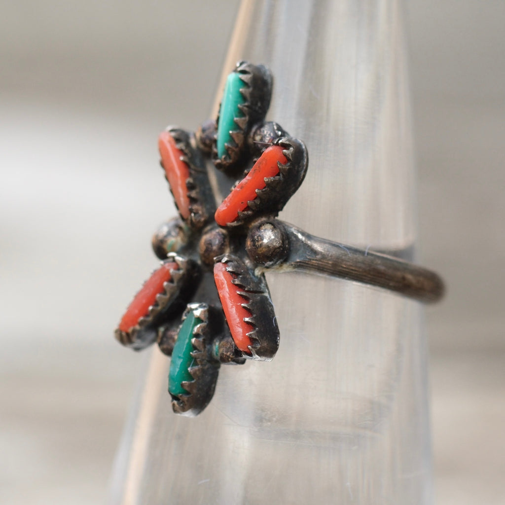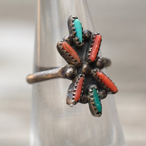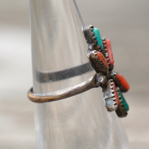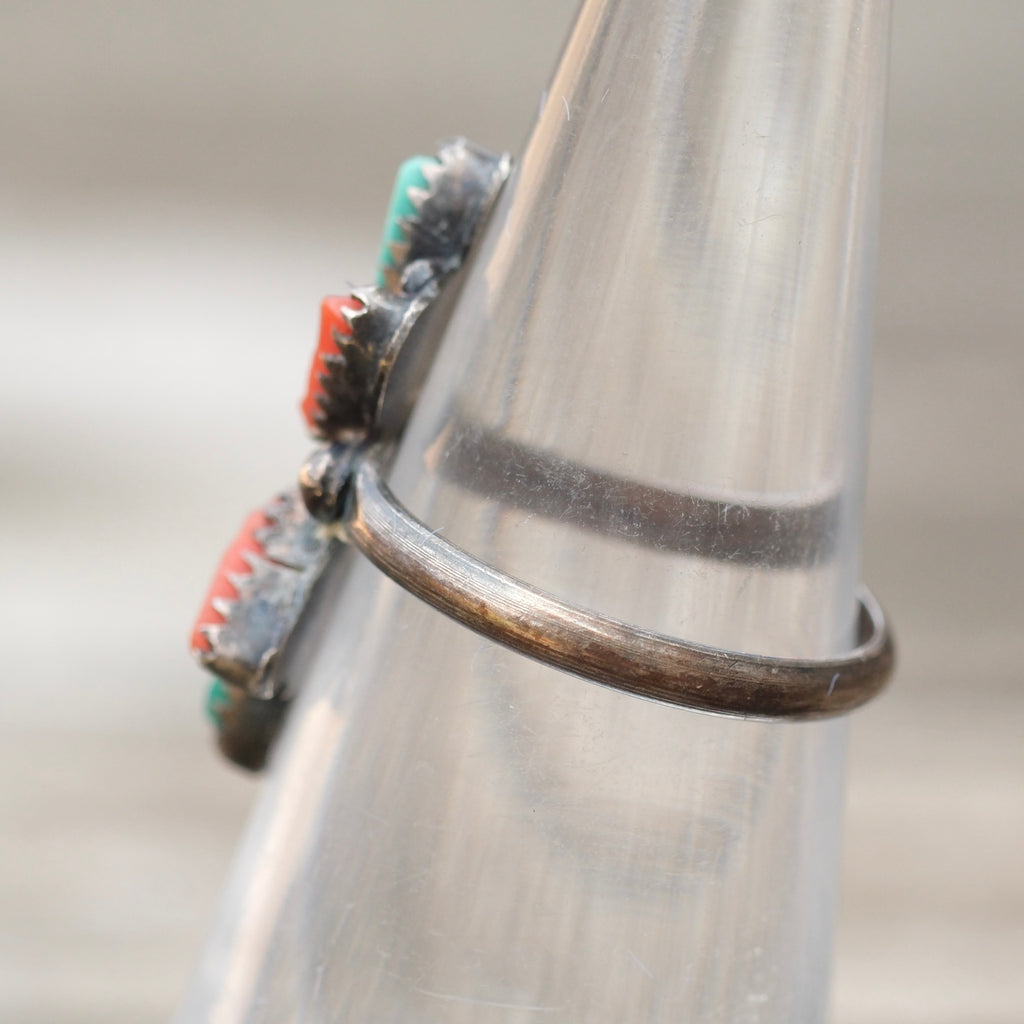Vintage Sterling Turquoise and Coral Cluster Ring 4.5