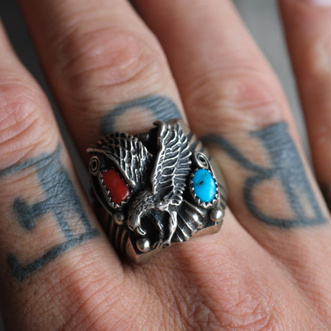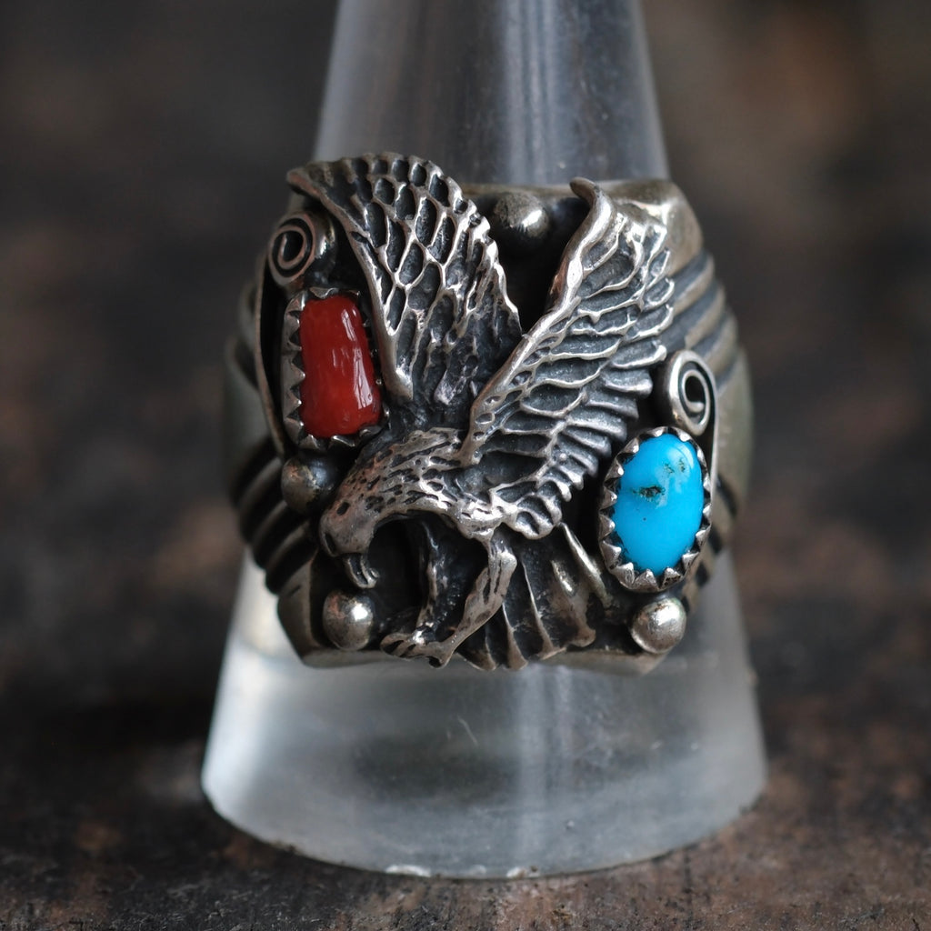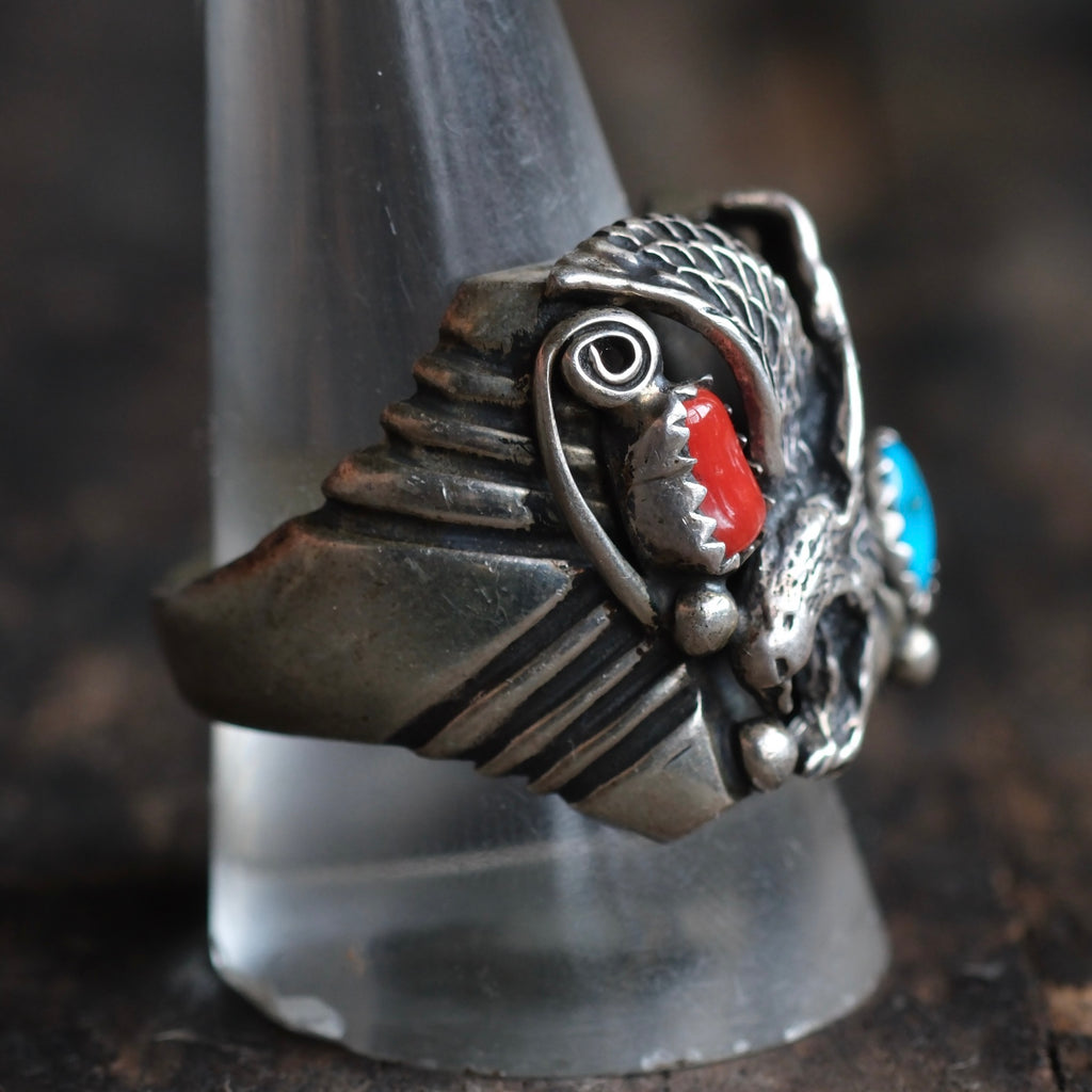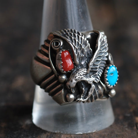 Vintage Sterling Turquoise and Coral Eagle Ring