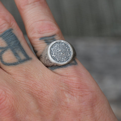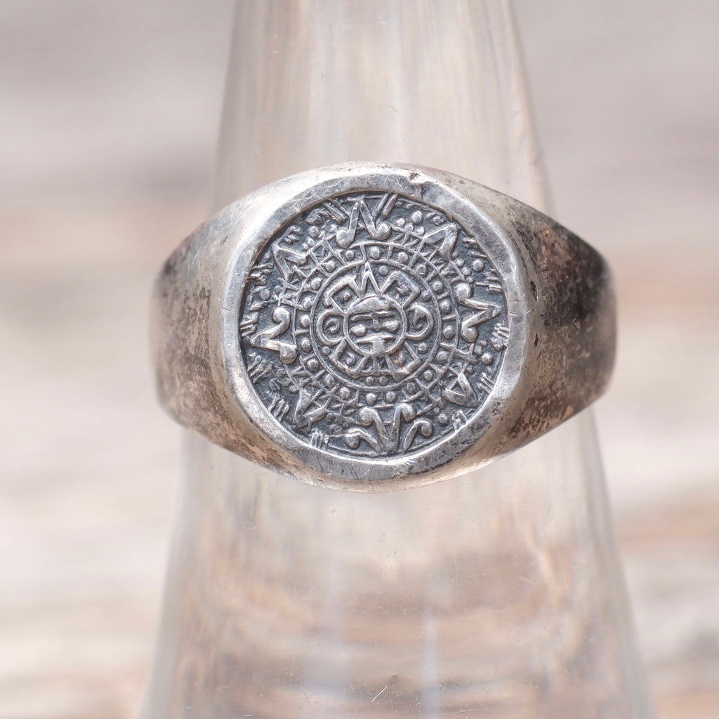 Vintage Sterling Silver Aztec Calendar Ring 7.25