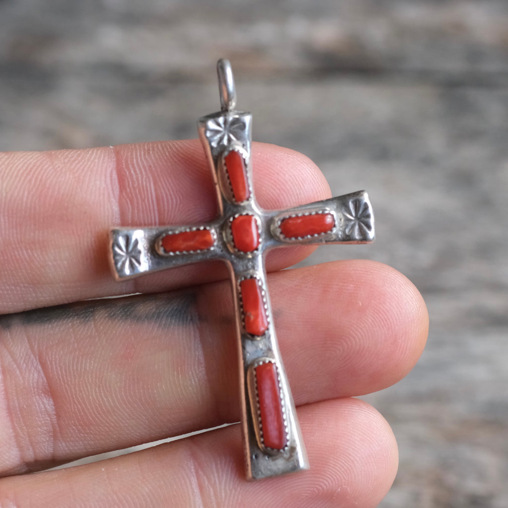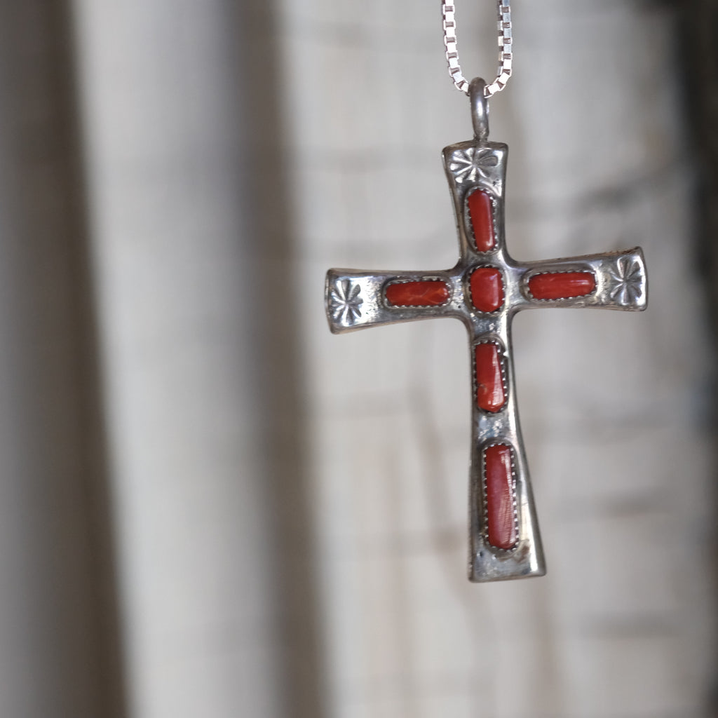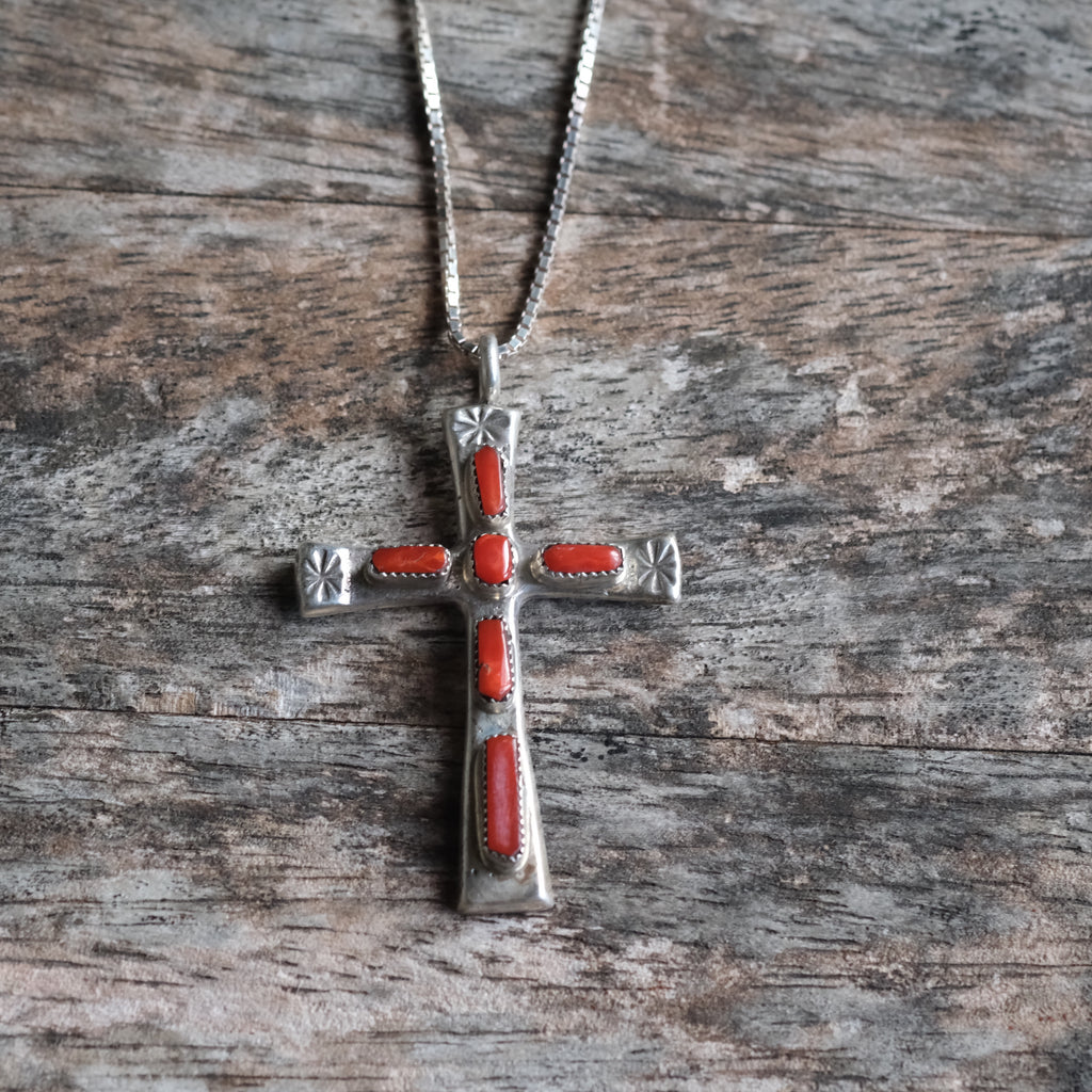 Vintage Sterling 7-Stone Coral Cross Necklace