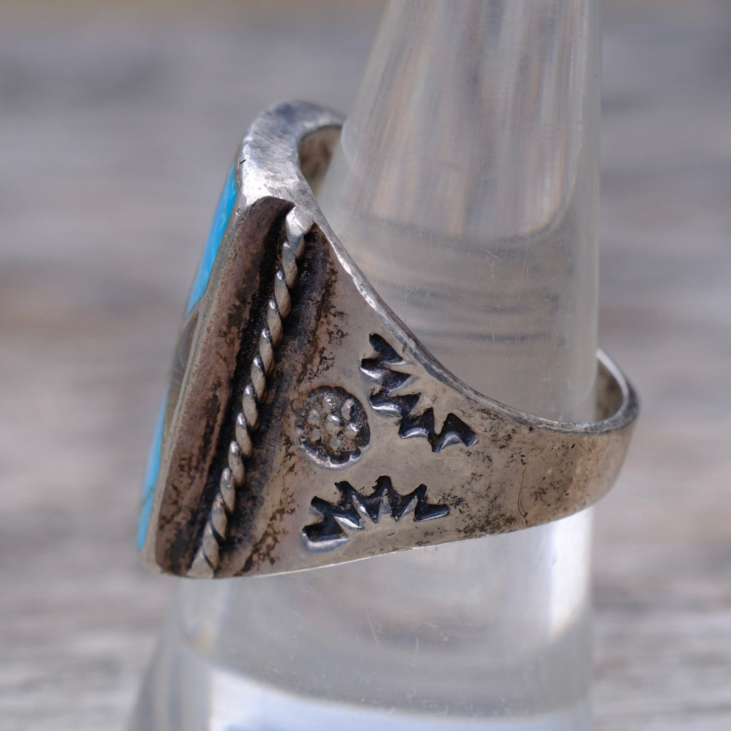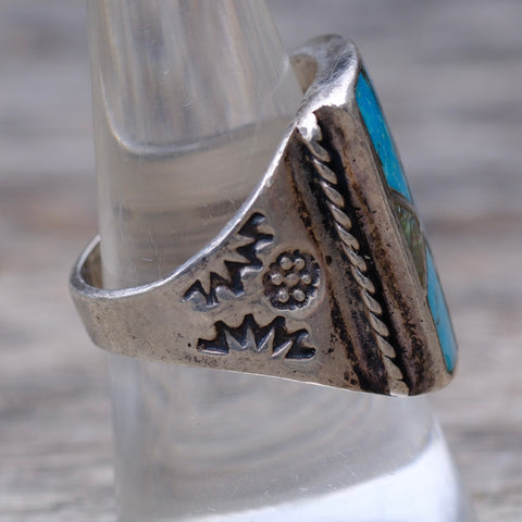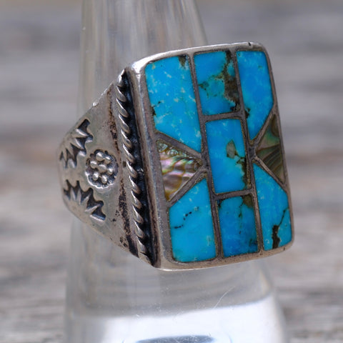 Vintage Sterling Turquoise and Abalone Inlay Panel Ring 9.5