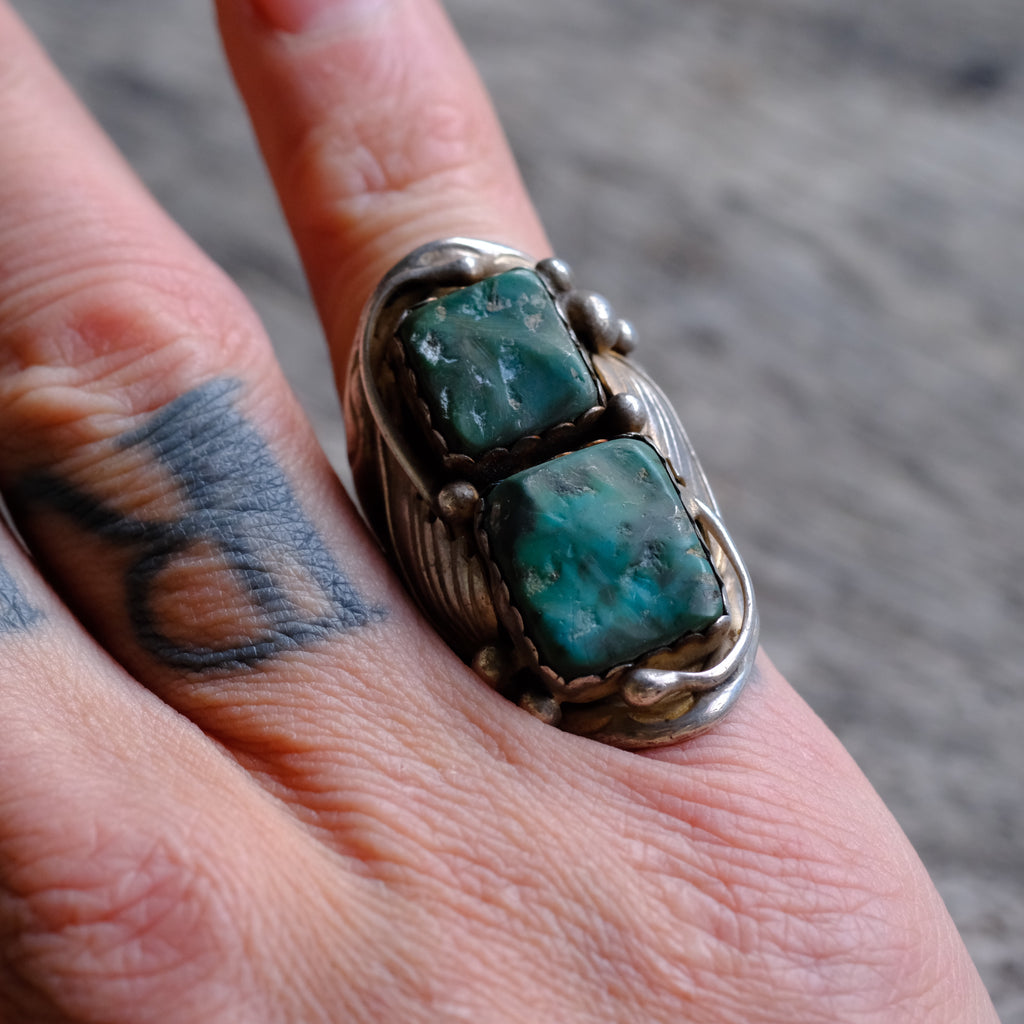 Vintage Sterling 2-Stone Turquoise Feather Ring 6.75