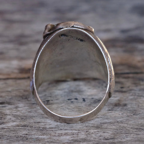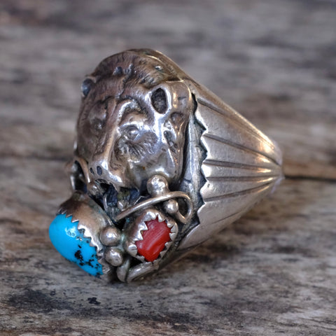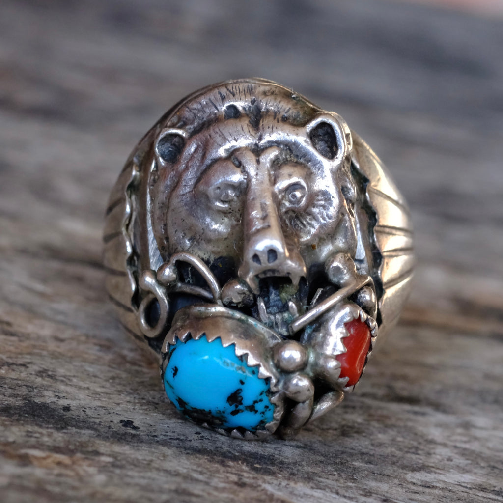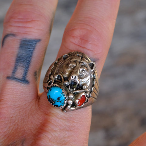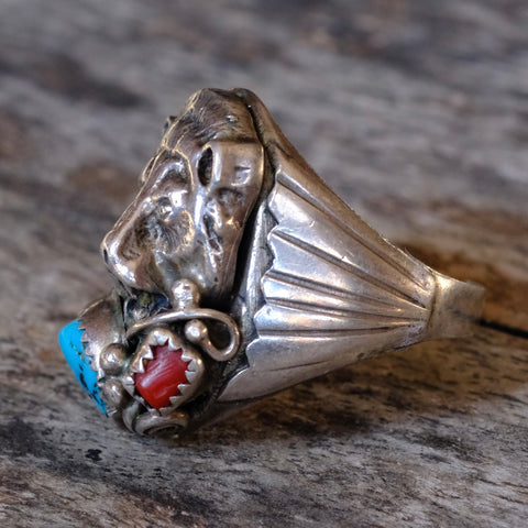 Vintage Sterling Turquoise and Coral Bear Ring 11.25