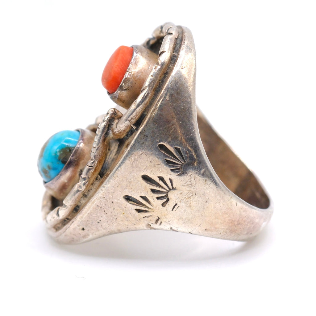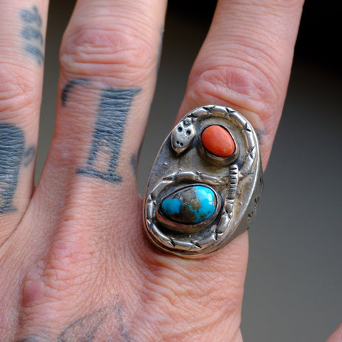 Vintage Sterling Turquoise and Coral Snake Ring 11