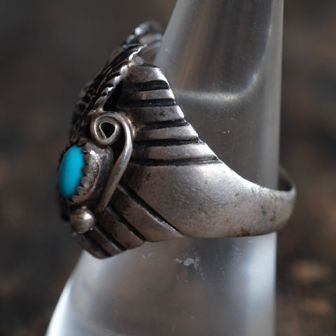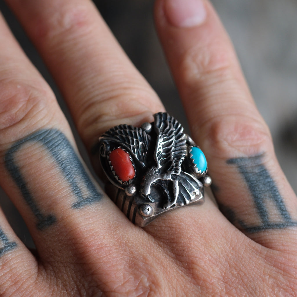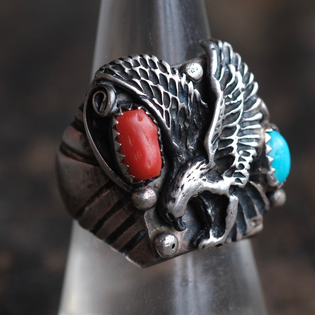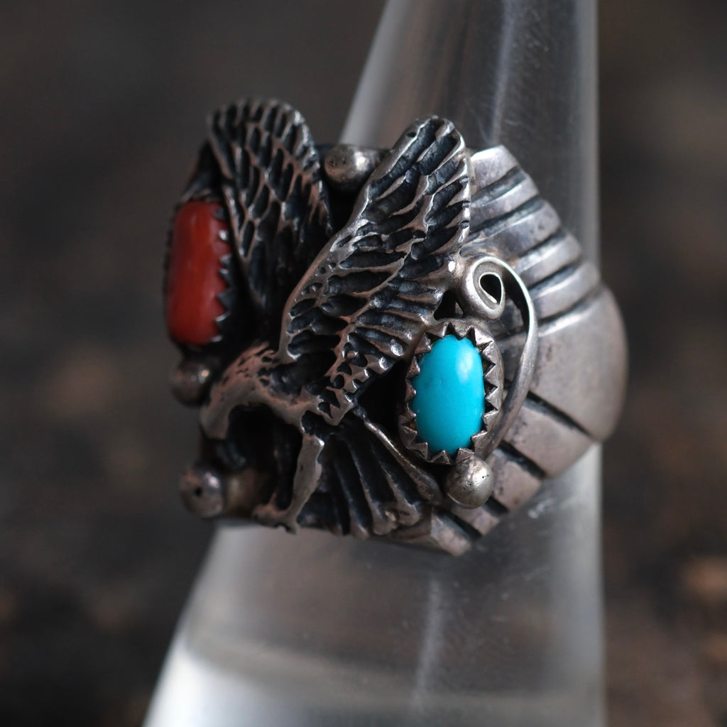 Vintage Sterling Turquoise and Coral Eagle Ring