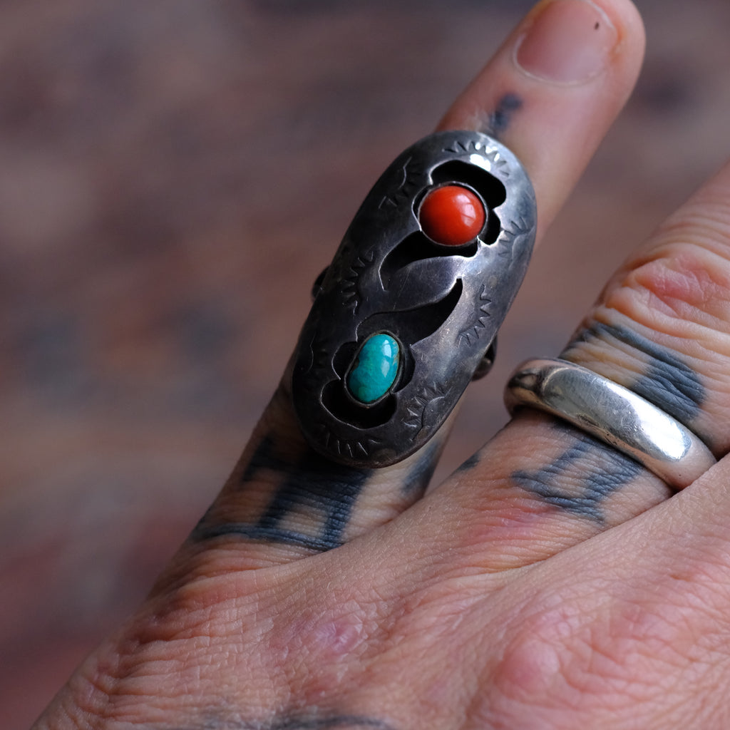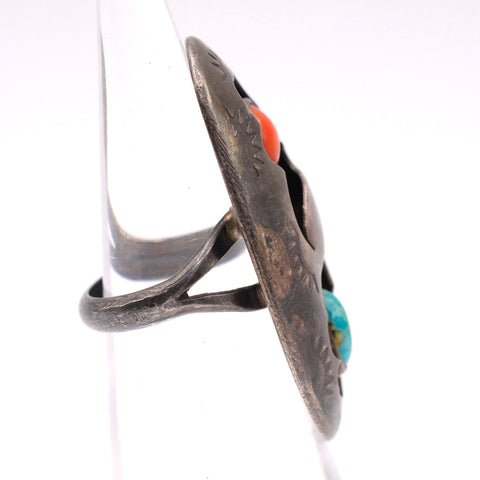 Vintage Sterling Turquoise and Coral Shadowbox Ring 3.75