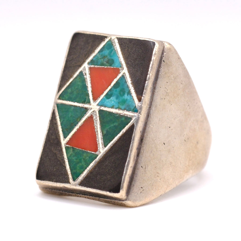 Vintage Sterling Jet Turquoise and Coral Inlay Ring 8