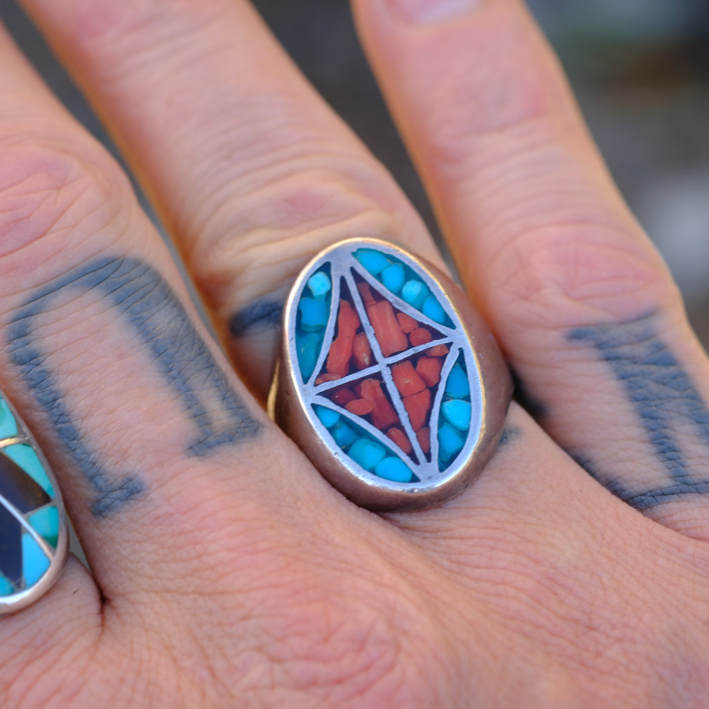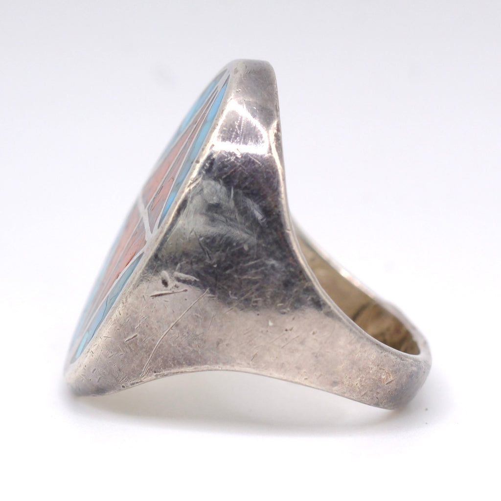 Vintage Sterling Turquoise and Coral Inlay Ring 8