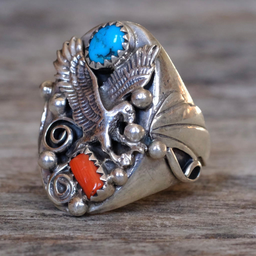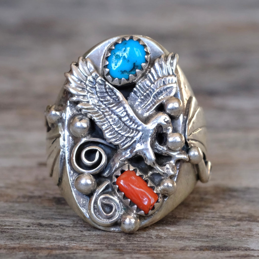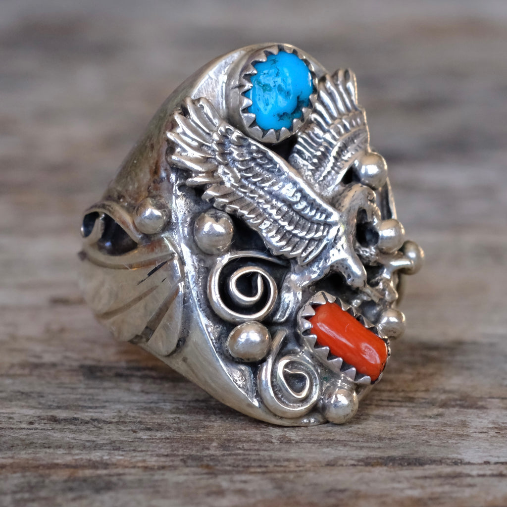 Vintage Sterling Turquoise and Coral Eagle Ring