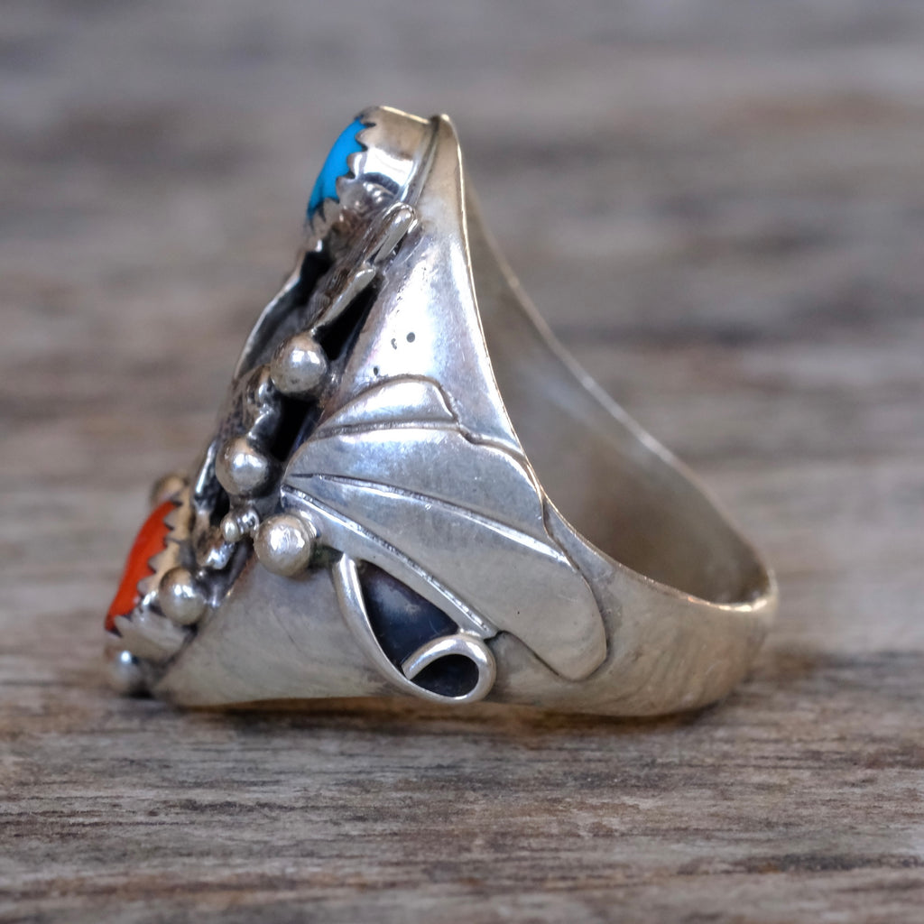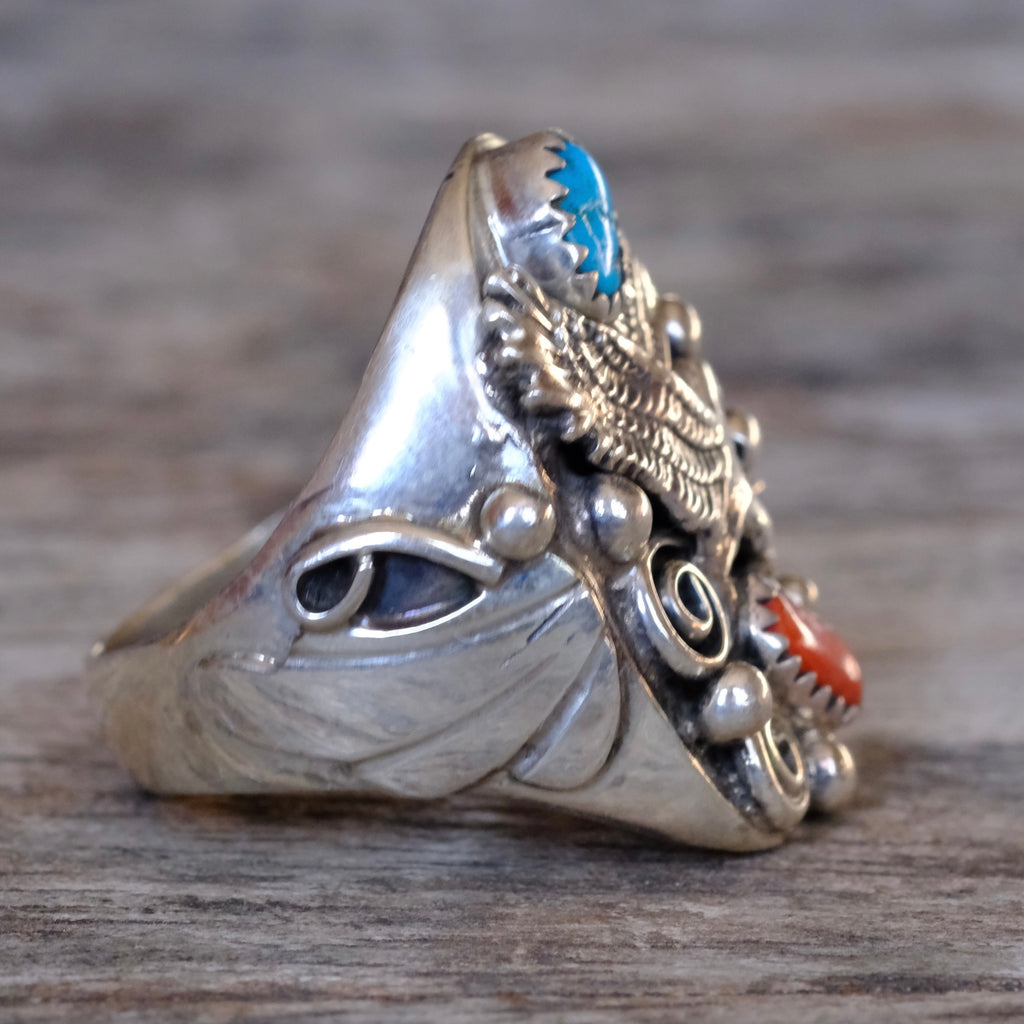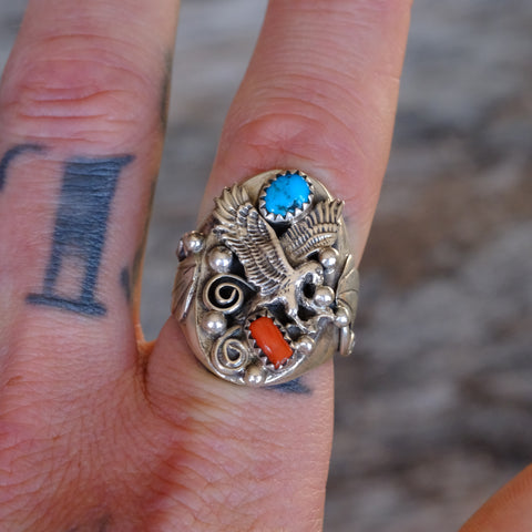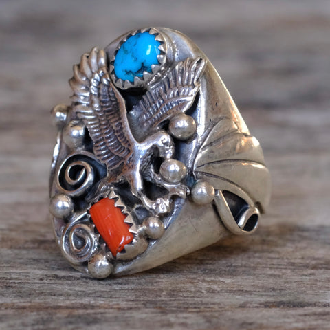 Vintage Sterling Turquoise and Coral Eagle Ring 9.5