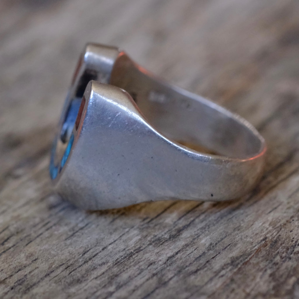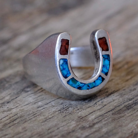 Vintage Sterling Turquoise and Coral Inlay Horseshoe Ring