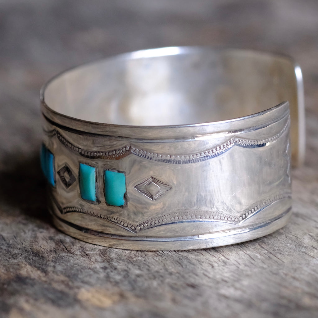 Vintage Sterling Turquoise Inlay Stamped Band Cuff Bracelet