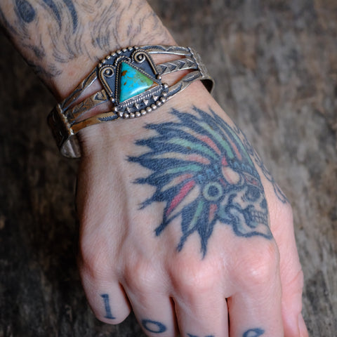 Vintage Fred Harvey Era Sterling Turquoise Stamped Cuff Bracelet