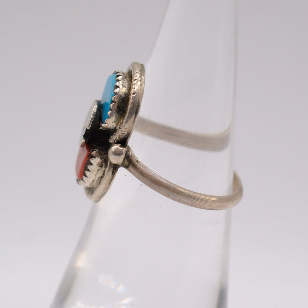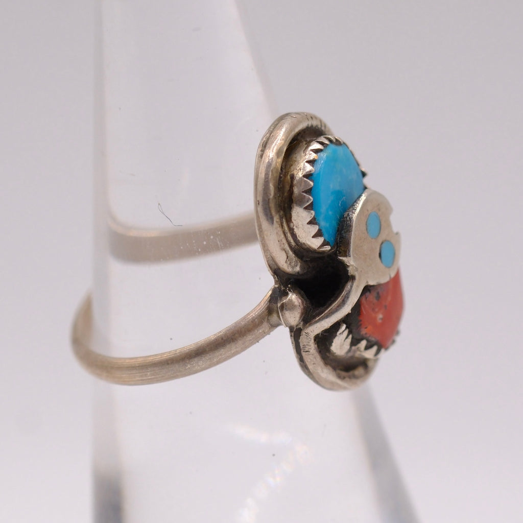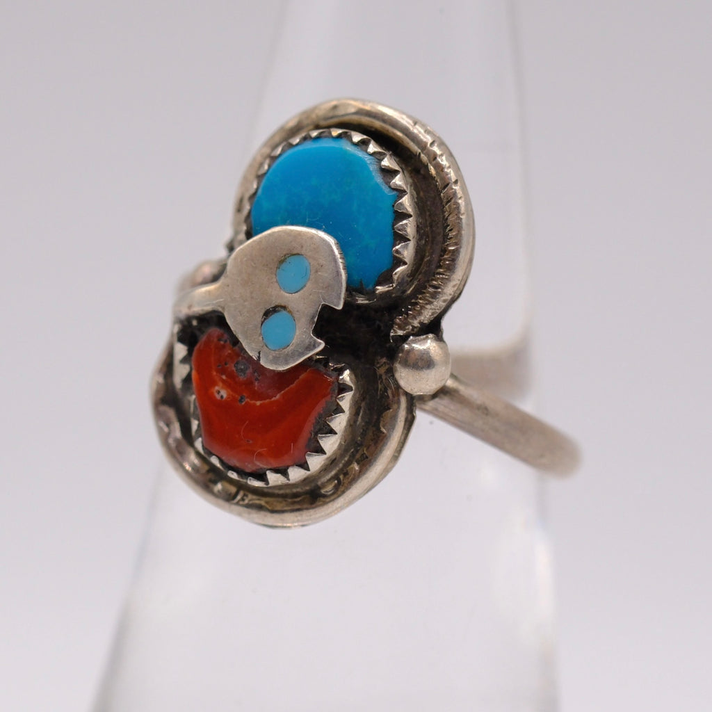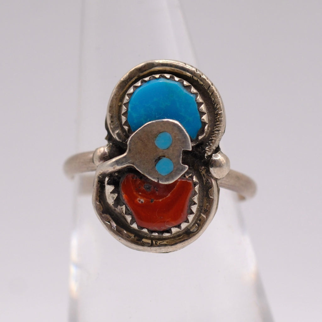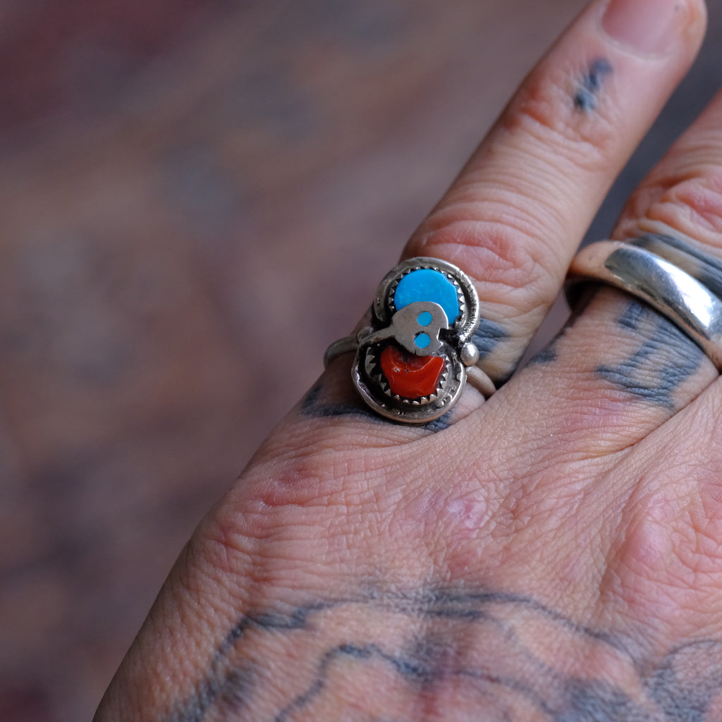 Vintage Sterling Turquoise and Coral Snake Ring 6.25