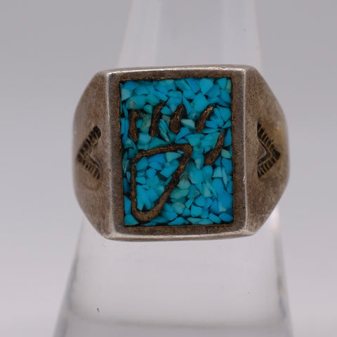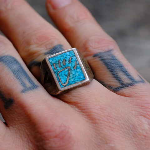 Vintage Sterling Crushed Turquoise Inlay Bear Paw Ring