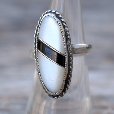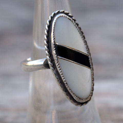 Vintage Sterling Onyx and Mother Of Pearl Inlay Ring
