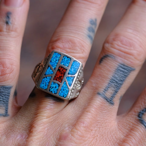 Vintage Sterling Turquoise and Coral Inlay Ring 9.5