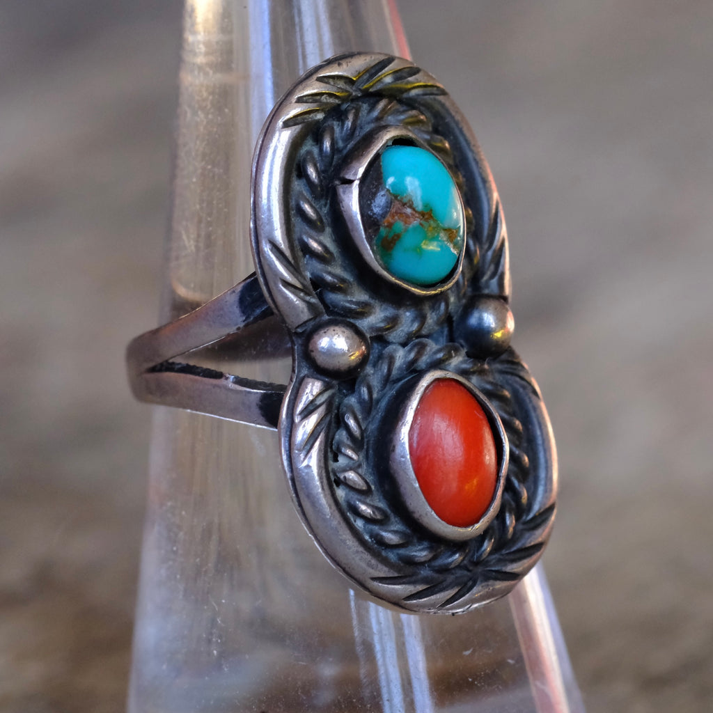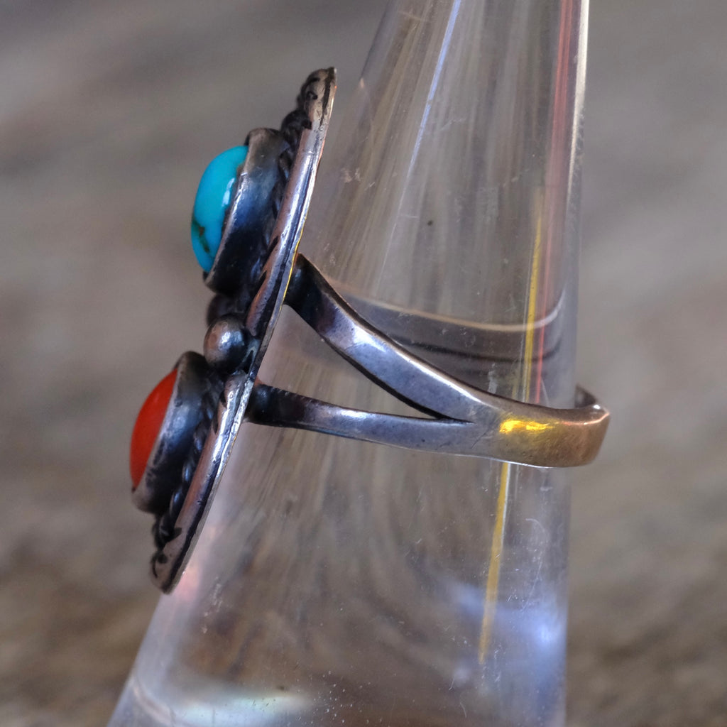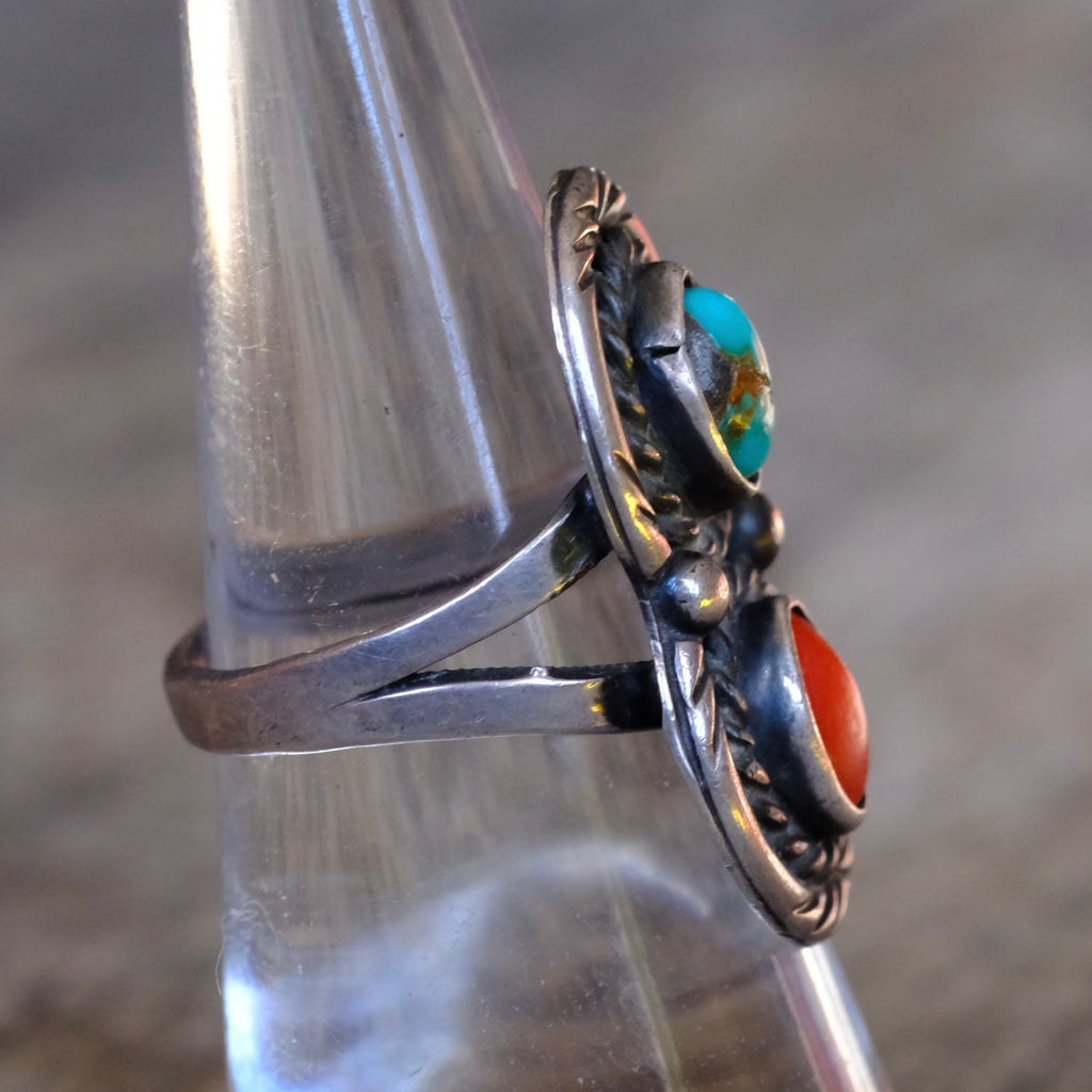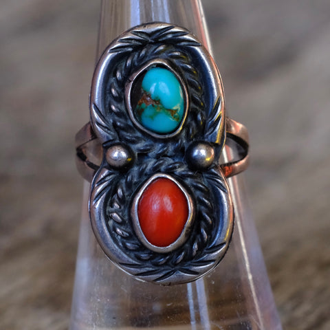 Vintage Sterling Turquoise and Coral Roper Ring 7