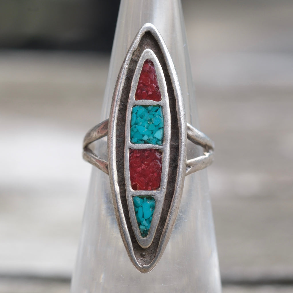 Vintage Sterling Turquoise and Coral Inlay Ring 4